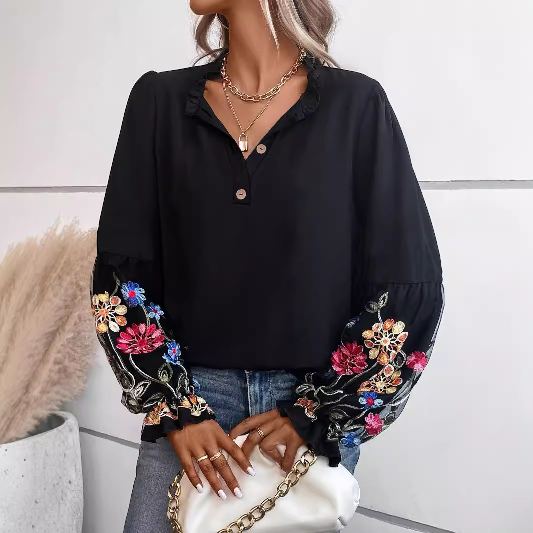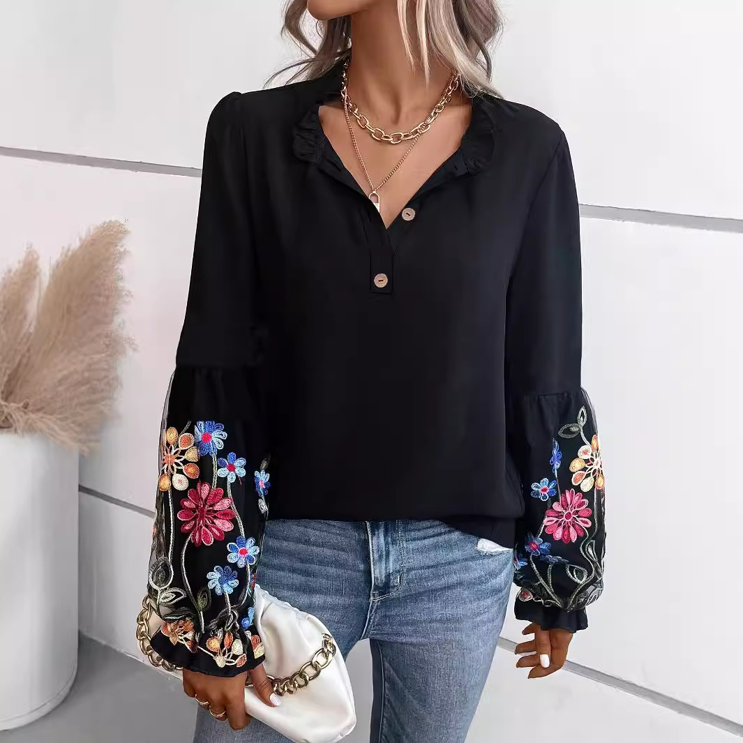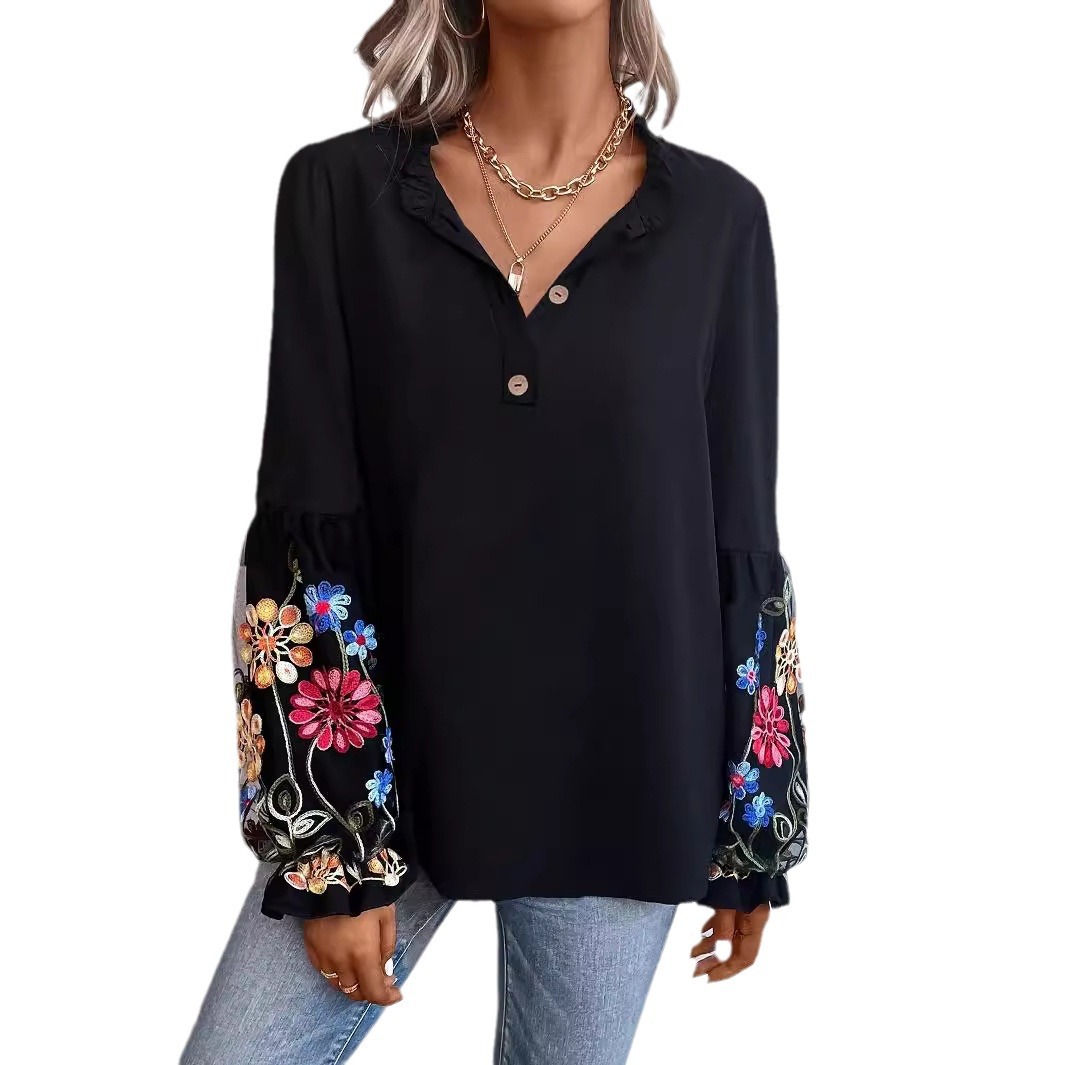 European And American Women's Long-sleeved Blouse Summer New Vacation Casual V-neck Top