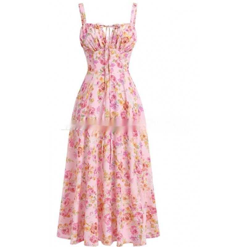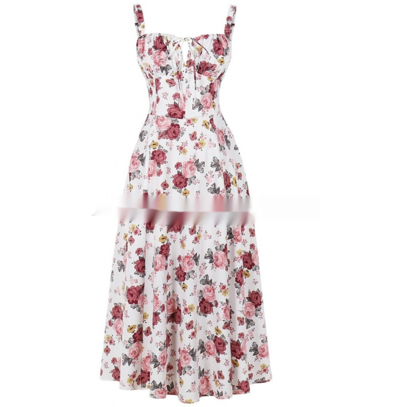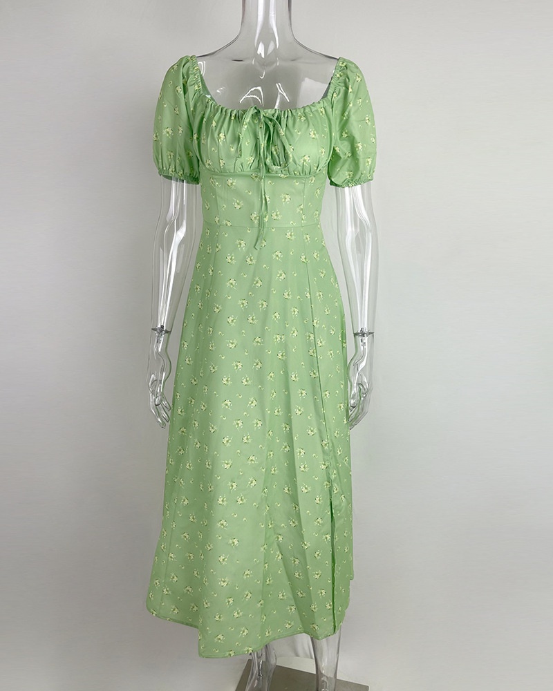 European And American Womens New Arrival Floral Print Square-Neck Sexy Slit Maxi Spring Dress