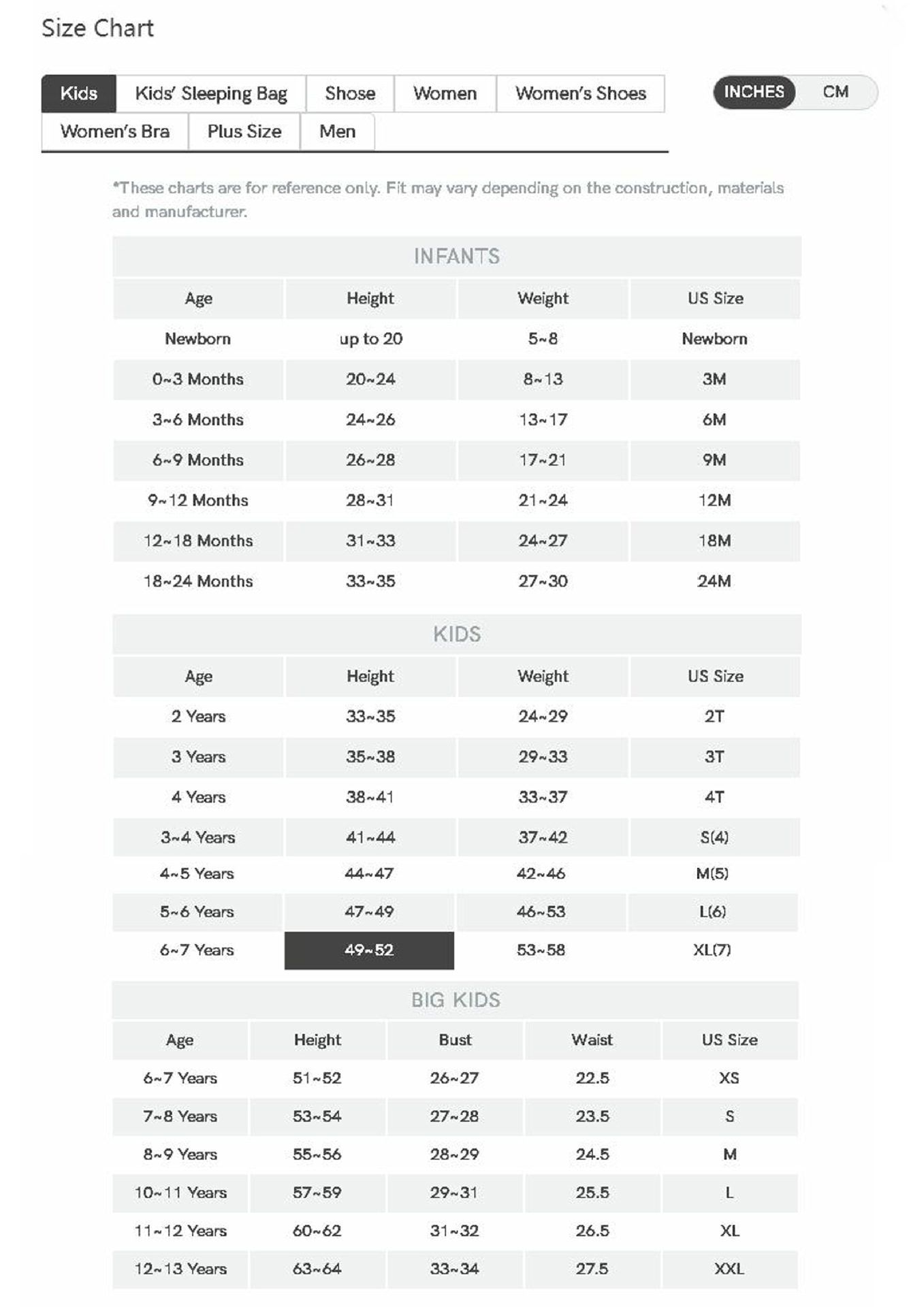 Size BB female: 6-9M, BB female: 9-12M, BB female: 12-18M, BB female: 18-24M, girl: 3Y, girl: 3-4Y, girl: 4-5Y, girl: 5-6Y , Girl: 6-7Y, Boy: 3Y, Boy: 3-4Y, Boy: 4-5Y, Boy: 5-6Y, Boy: 6-7Y, Women: S, Women: M, Women: L, Women's clothing: XL, Men's clothing: M, Men's clothing: L, Men's clothing: XL, Men's clothing: XXL