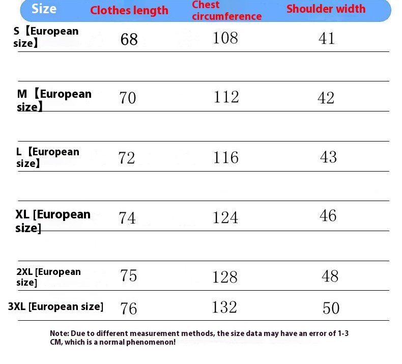 Size: S [European code],M [European code],L [European code],XL [European code],2XL [European code],3XL [European Code]]