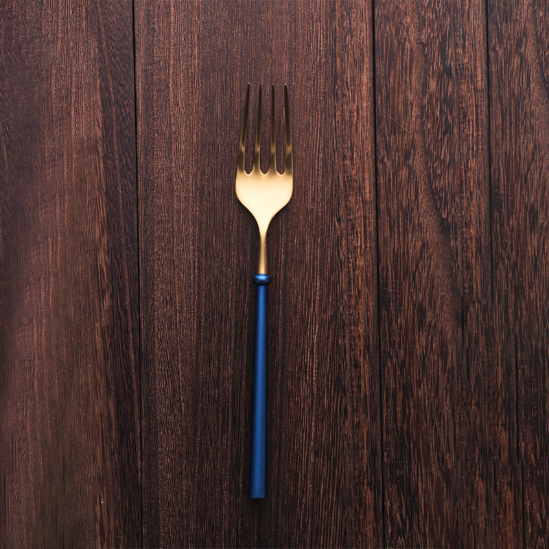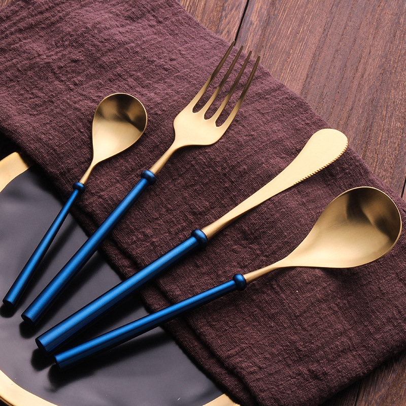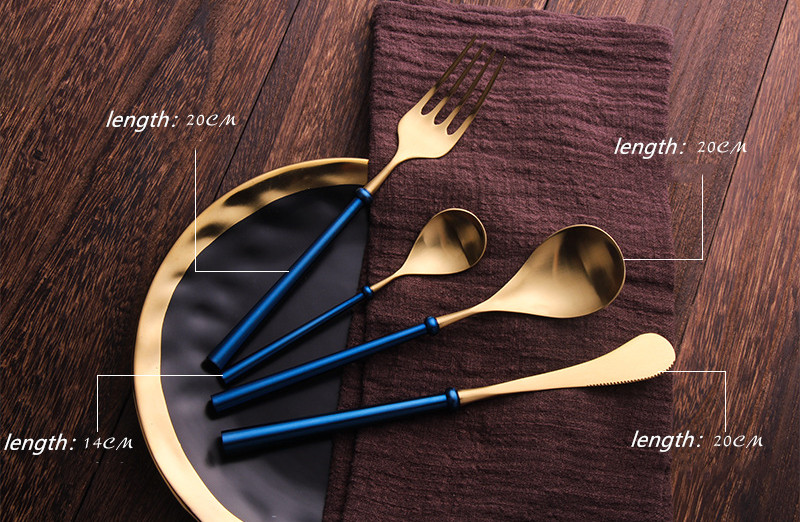 Specifications:A- blue handle gold head + main table knife, B-blue handle gold head + main dinner fork, C-blue handle gold head + main dinner spoon, D-blue handle gold head + tea spoon, F-blue handle gold head + four-piece set