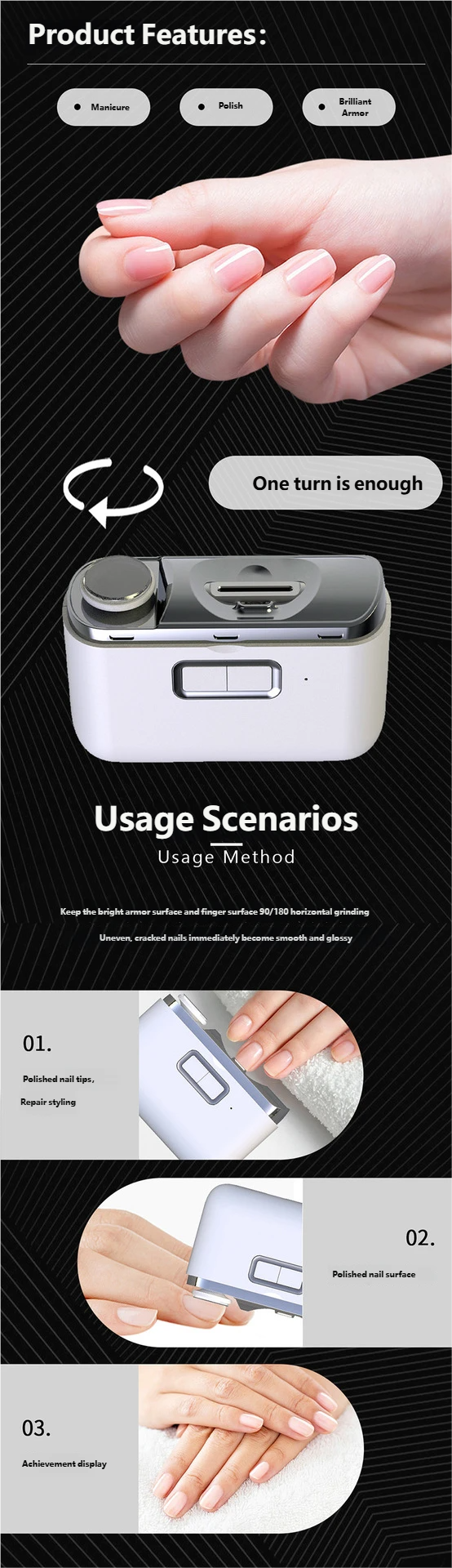 Manicure Care: Quickly shape and polish nails to achieve a professional manicure look.