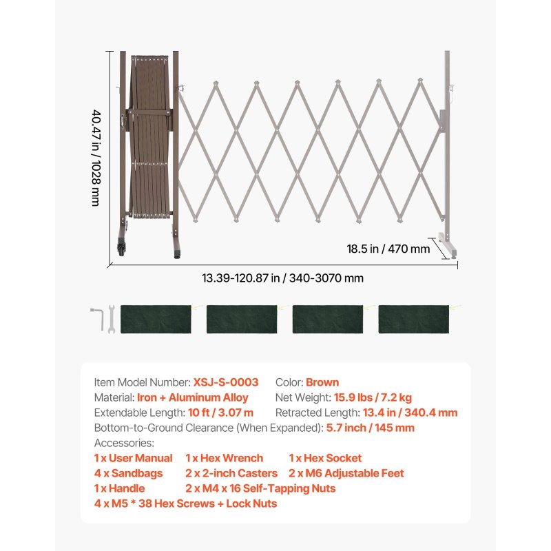 Sturdy & Durable: Our expandable safety barrier is constructed with aluminum mesh and iron posts, finished with a powder-coated surface for long-lasting durability. Four sandbags are included to enhance stability and help prevent tipping in wind and rain