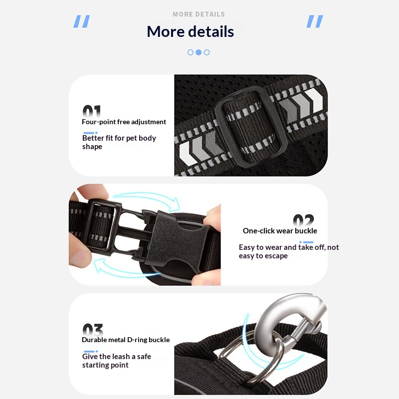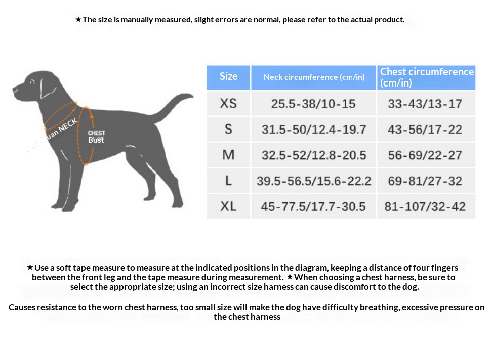 Applicable Sizes: XS [Chest circumference 33–43 cm] recommended for 2–5 kg; S [Chest circumference 43–56 cm] recommended for 4–7 kg; M [Chest circumference 56–69 cm] recommended for 7–18 kg; L [Chest circumference 69–81 cm] recommended for 18–30 kg; XL [Chest circumference 81–107 cm] recommended for 30–50 kg.