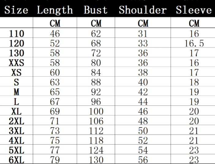 Size: XXS, XS, S, M, L, XL, XXL, 3XL, 4XL, 5XL, 6XL, 110, 120, 130