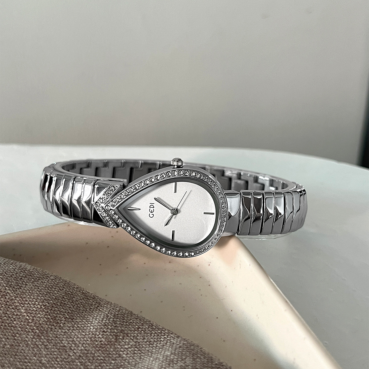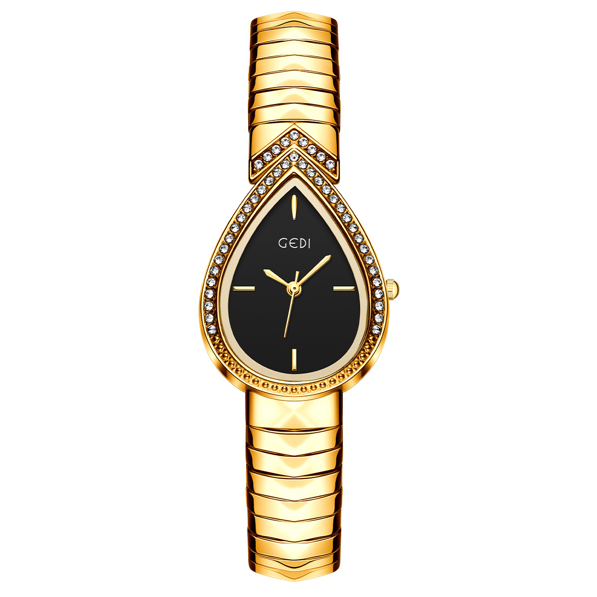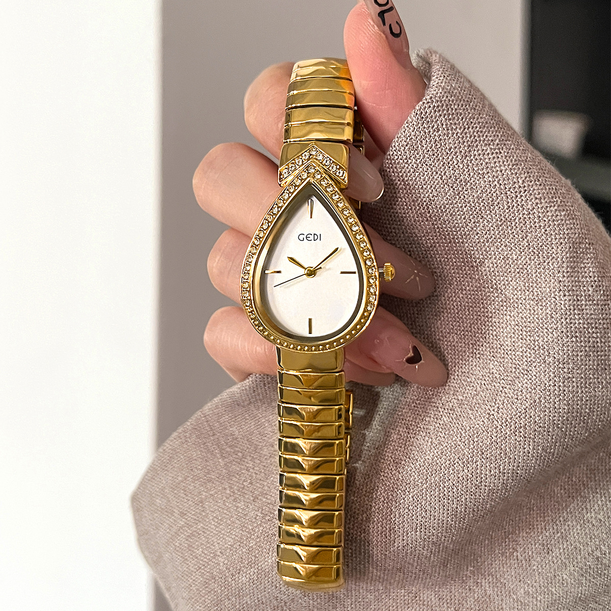 Colors: Gold case, gold dial, gold strap; gold case, black dial, gold strap; white case, white dial, white strap; gold case, white dial, gold strap; white case, black dial, white strap