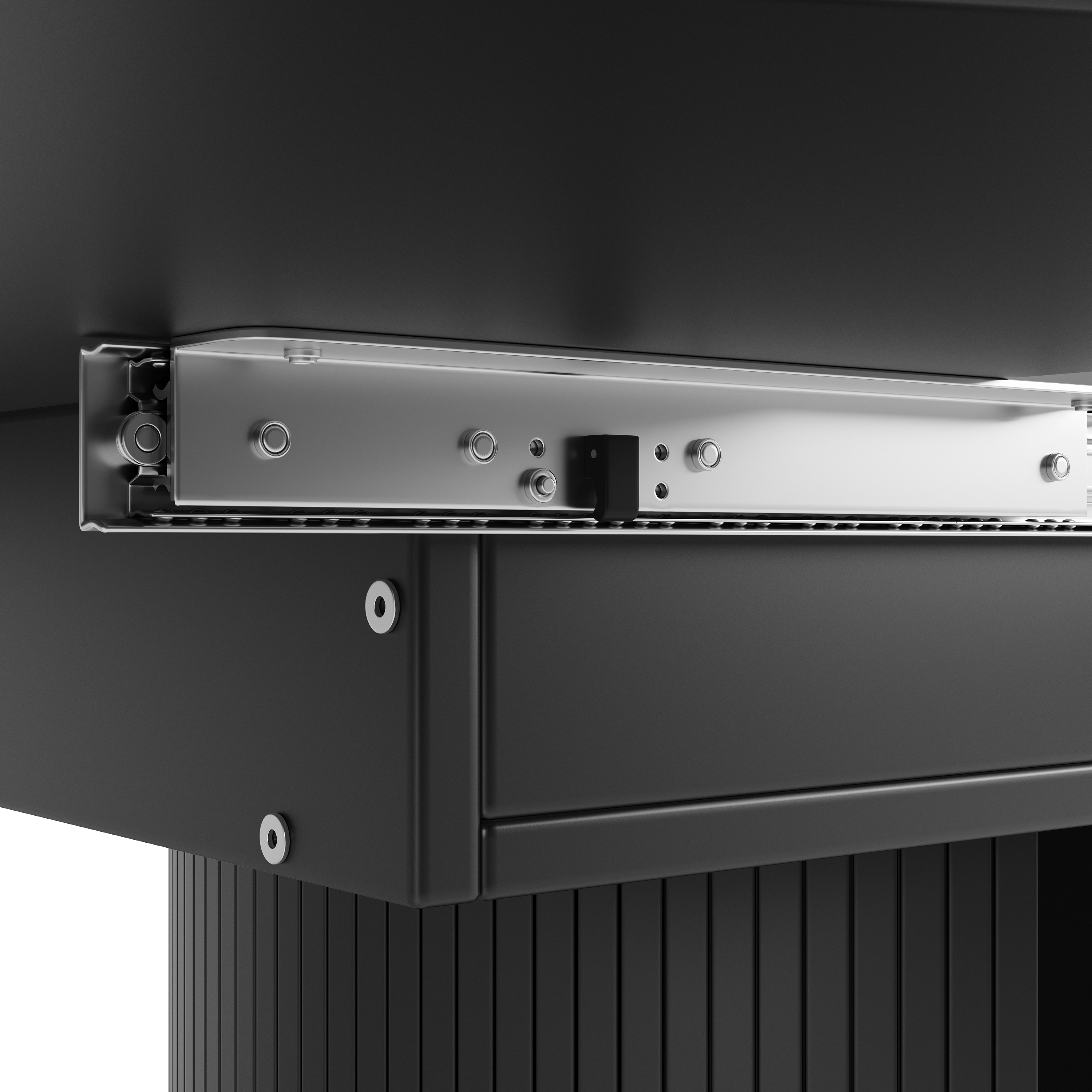 The support section features additional storage space with convenient curved sliding doors. Two internal shelves provide easy access to tableware, glassware, and other essentials, keeping everything within reach.