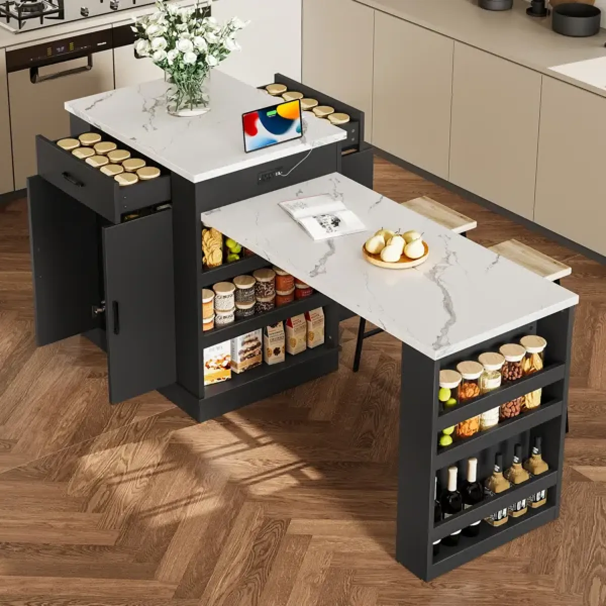 Extendable Island Console With Drawers, Double-door Cabinet, And Open Shelving. Serves As Dining Table, Temporary Breakfast Bar, And Afternoon Tea Lounge,Black