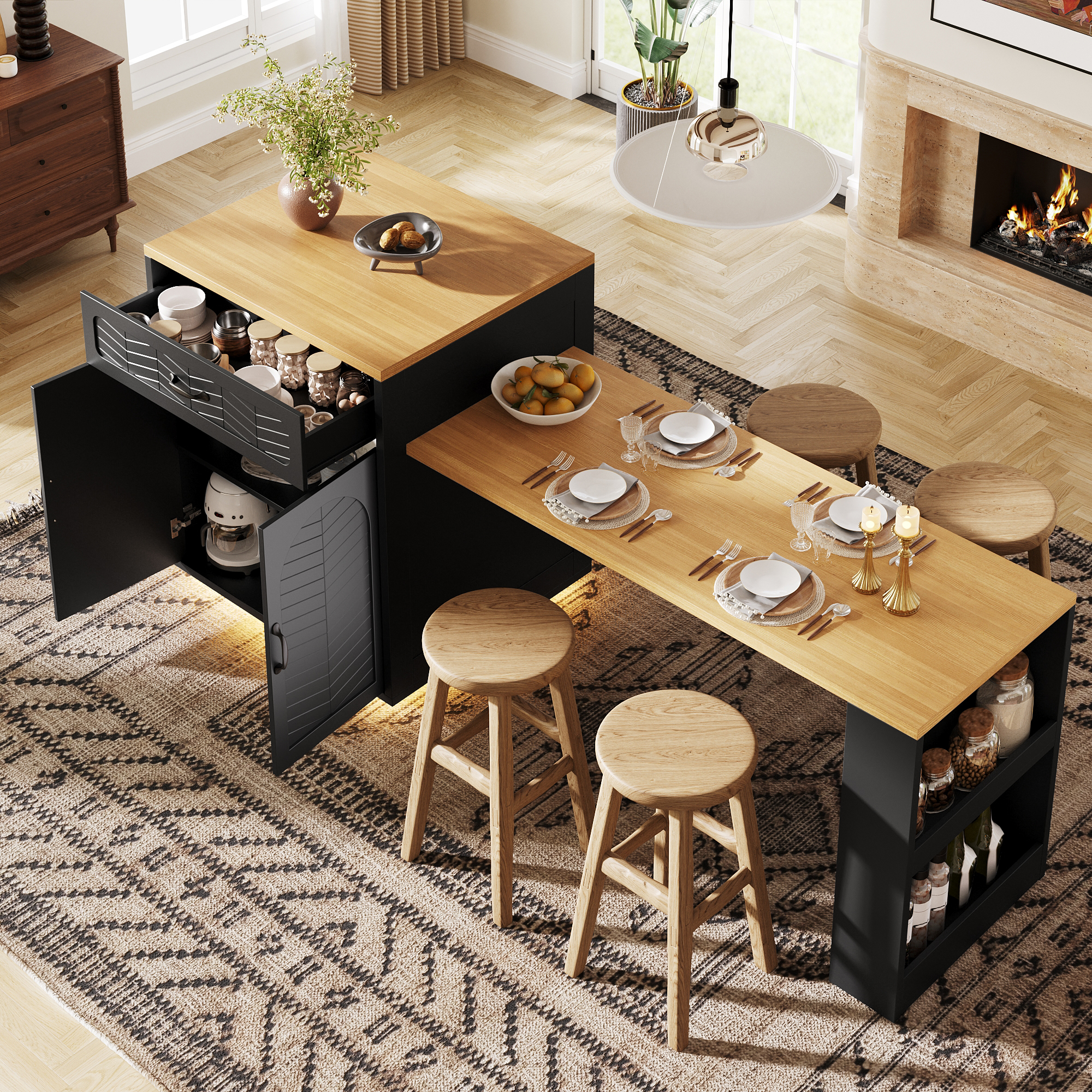 • Multifunctional Design for Modern Living:Whether used as a kitchen prep station, a dining hub, or a stylish storage solution, this extendable kitchen island adapts to your lifestyle, making it a perfect fit for both small and large kitchen spaces.