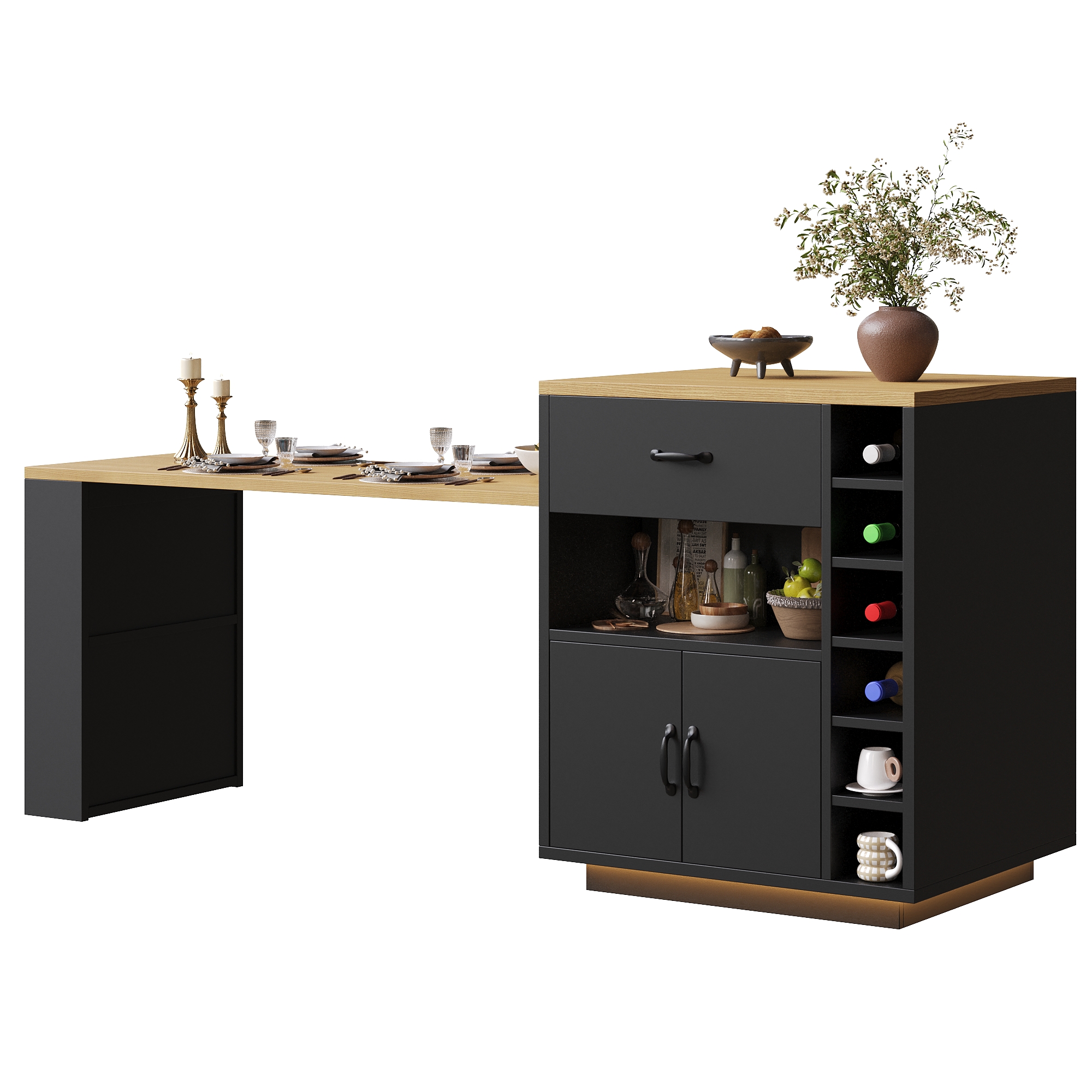 Extendable Kitchen Island With Dining Table, Multifunctional Storage Cabinet With Drawers, Doors, Wine Rack & LED Light, For Kitchen & Dining Room