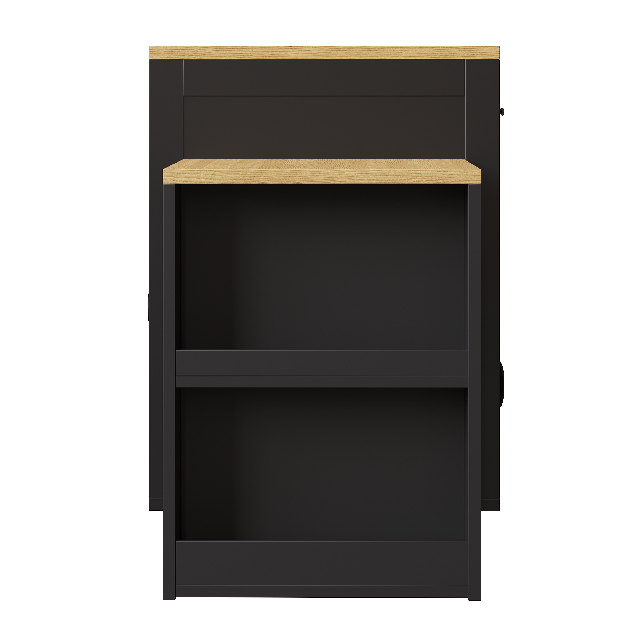 This kitchen island offers comprehensive storage: a top drawer, two cabinet doors with internal shelves, a built-in wine rack on the back, an open storage area, and a double-tier shelf on the side, ideal for dishes, utensils, and wine bottles.