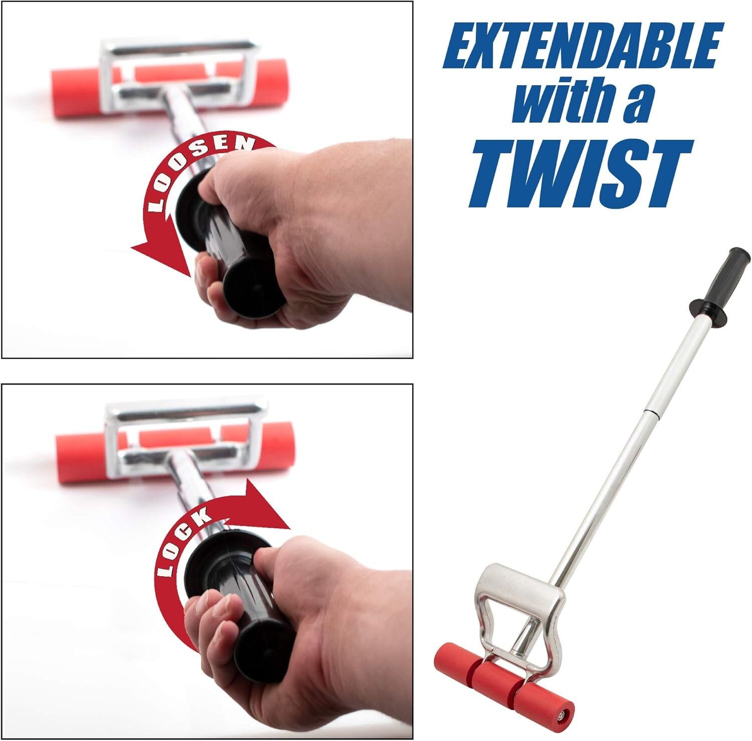 --- When pressure is applied to felt, carpets, tiles, wallpaper, laminates, large veneer projects, etc., the expandable heavy-duty roller provides excellent leverage. This tool is equipped with an ergonomic heavy-duty lever handle and rubber rollers, making what was once a difficult project a breeze.