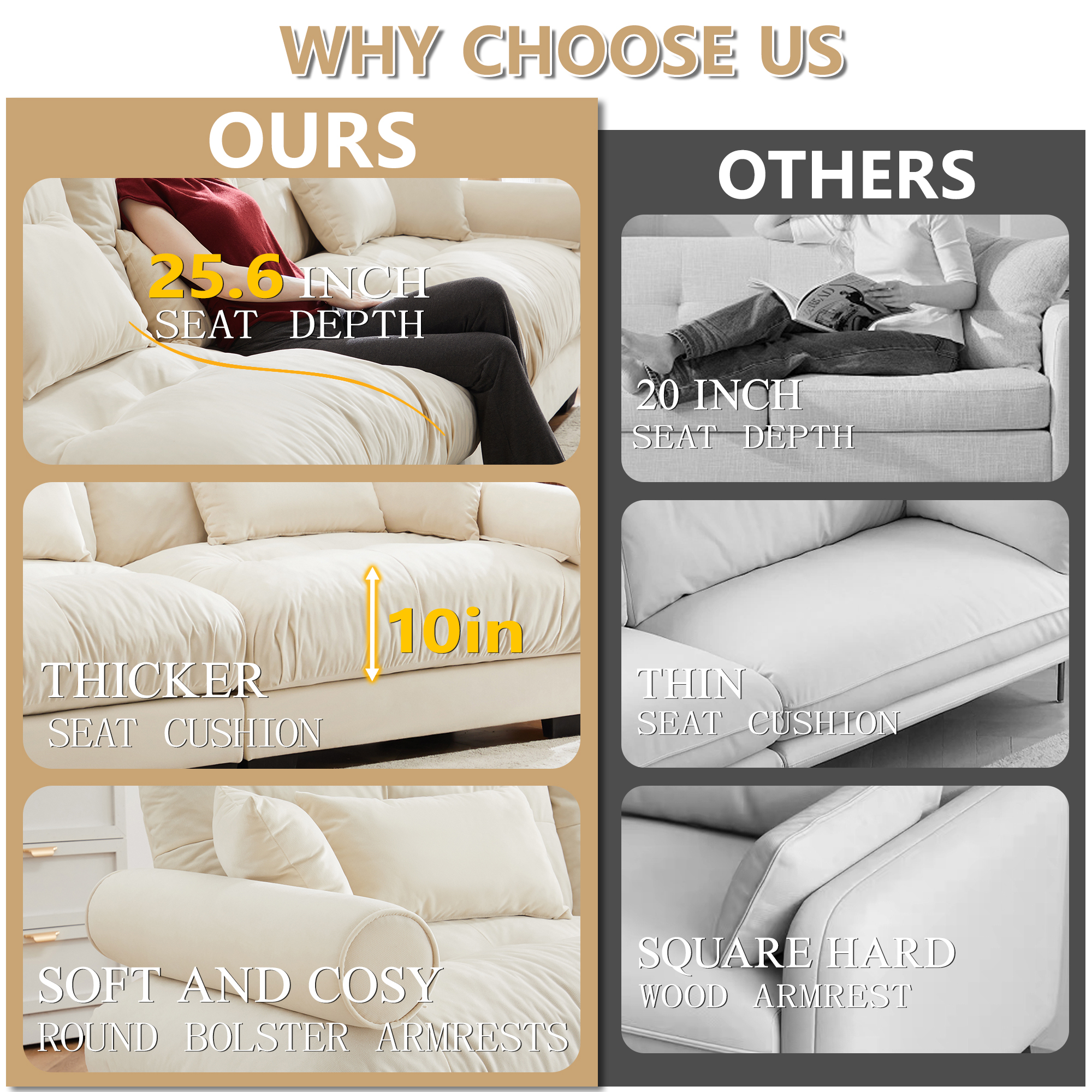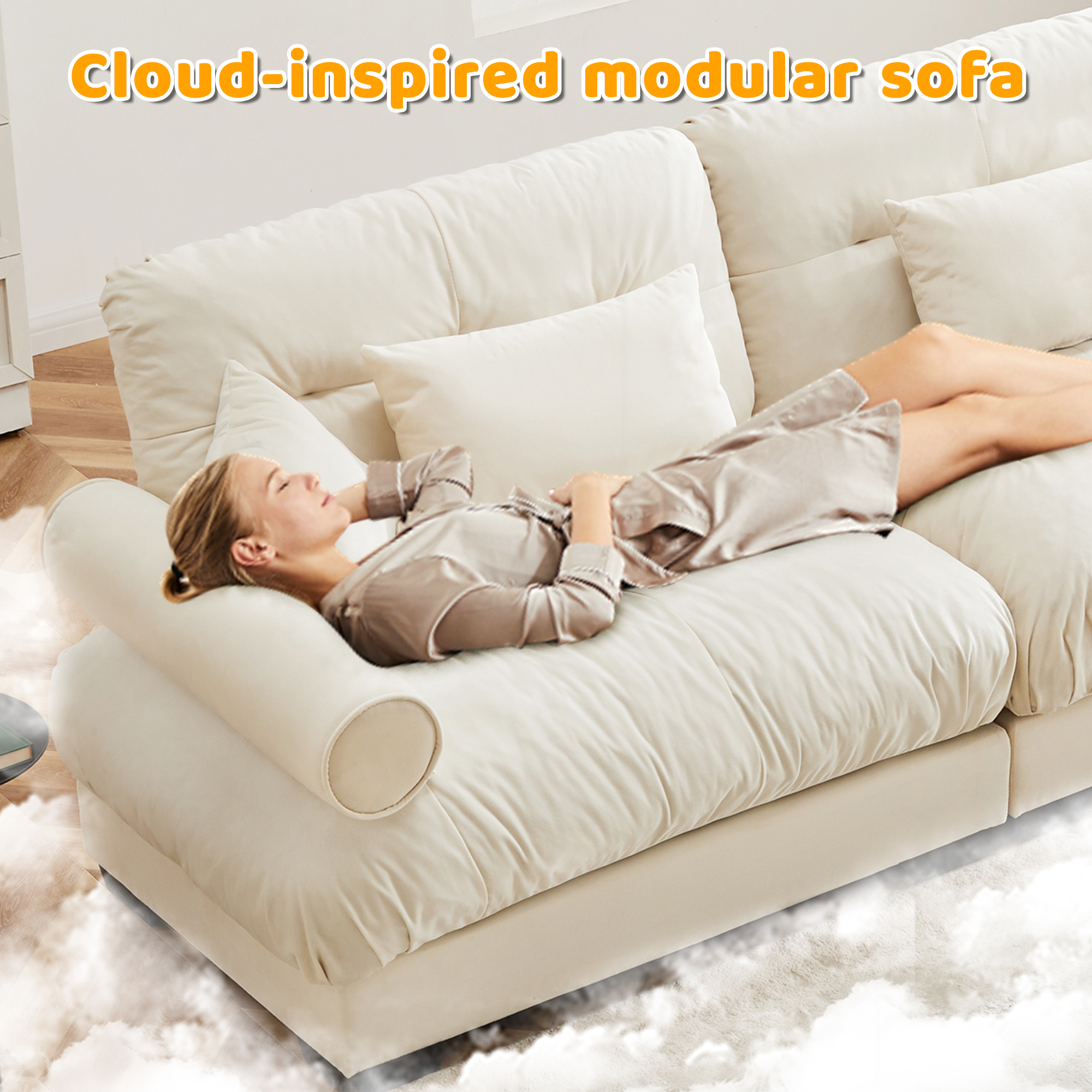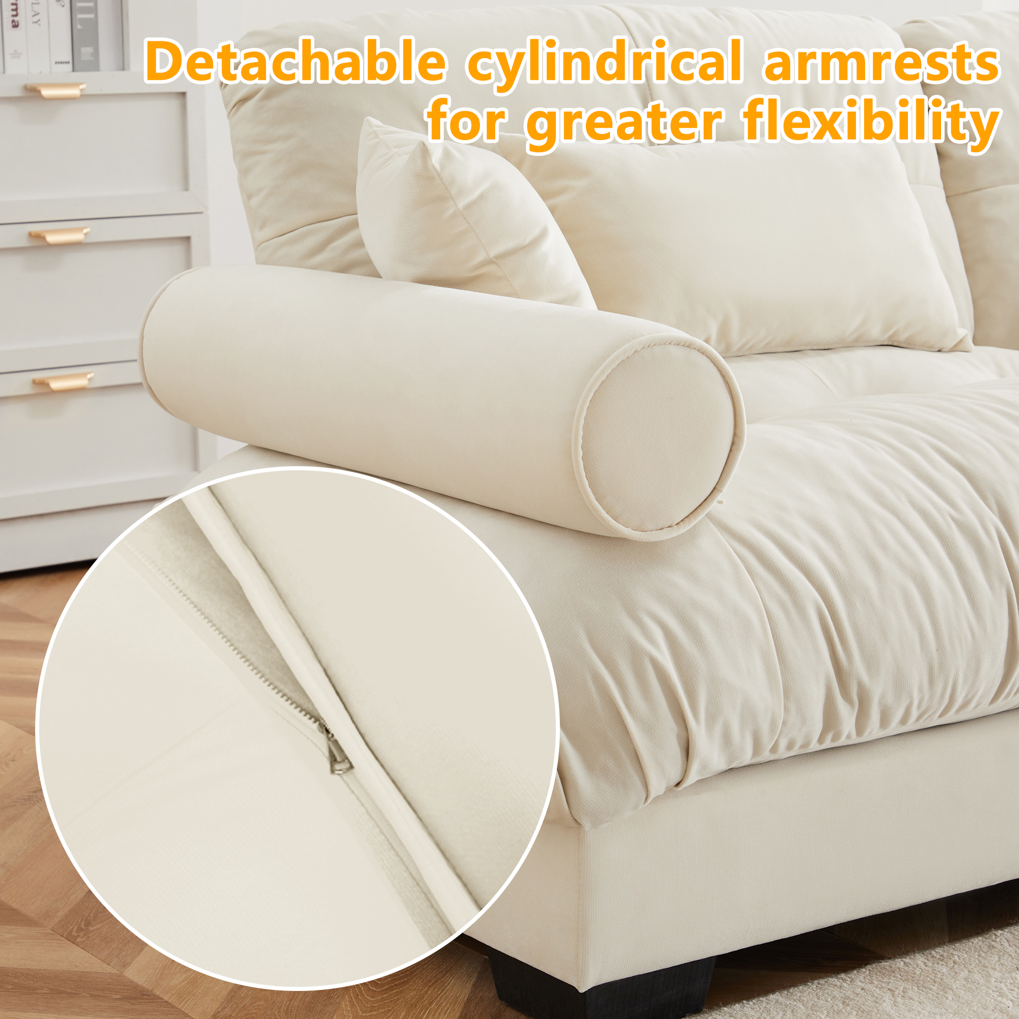 Product Name:Extra Large 3 Seat Modern Velvet Sofa, Oversize Sofa, Clould Like Comfortable Seat and Back Support, With Waist Pillows and Throw Pillows, Cream