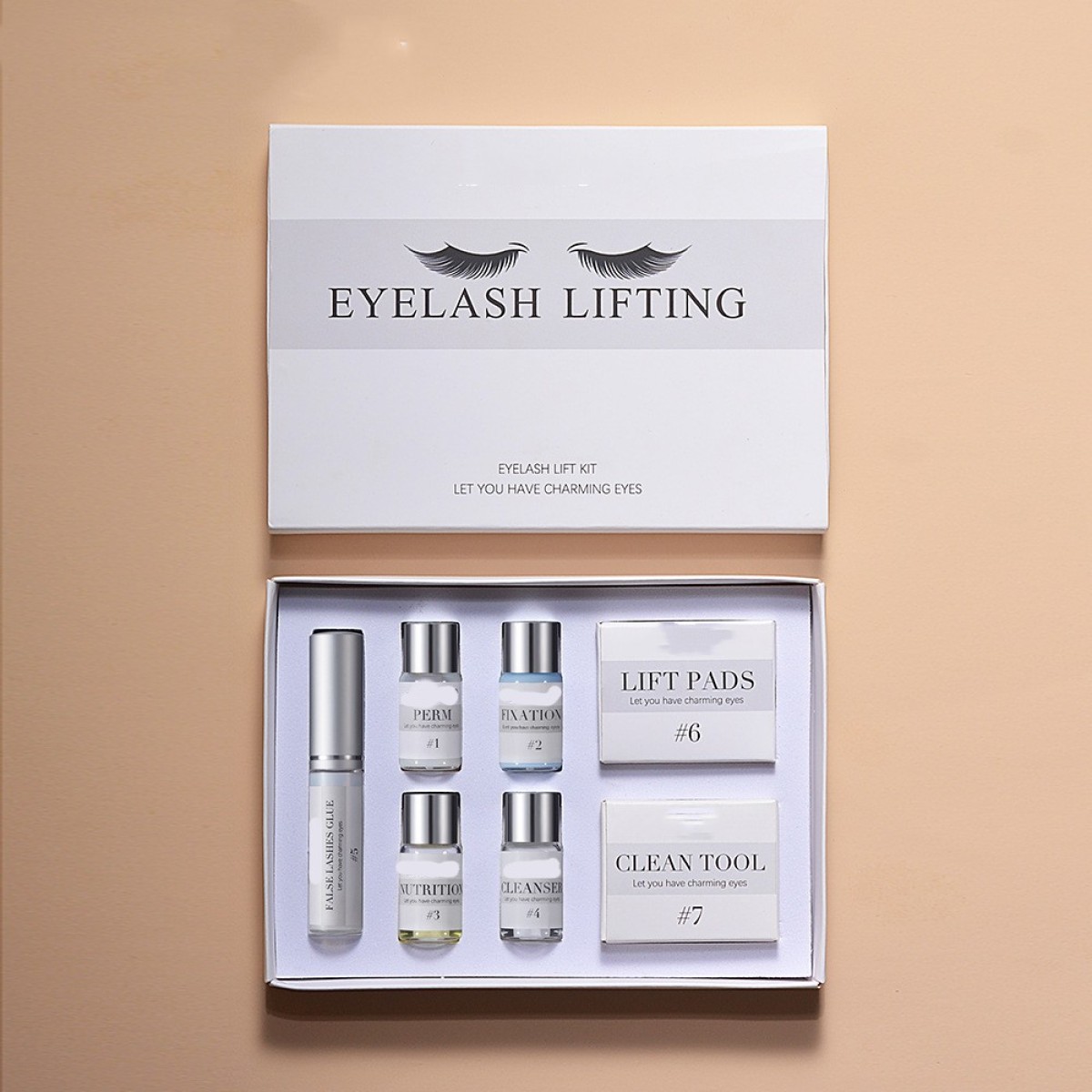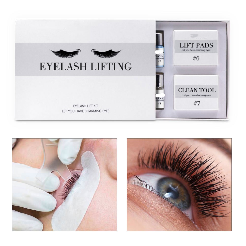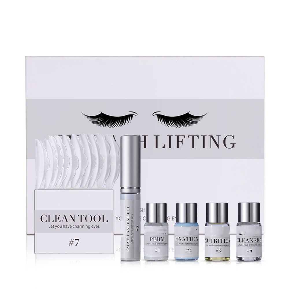 A bottle of scalding agent, a bottle of fixative, a bottle of nourishing care agent, a bottle of cleaning agent, a bottle of eyelash gel, a silicone pad, and a comb stick