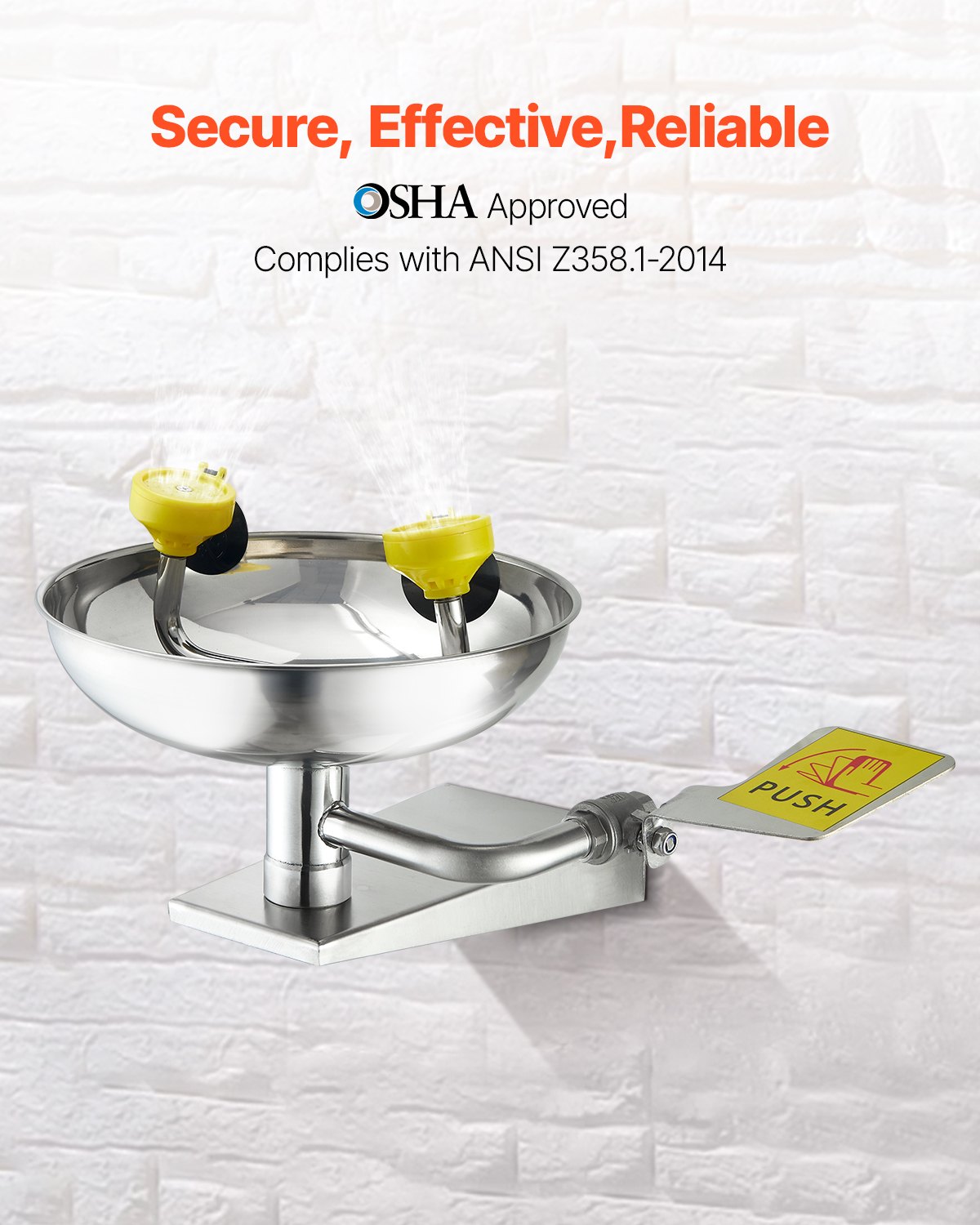 Security Certification: This eye wash station complies with OSHA standards and ANSI Z358.1-2014 certification. It features a flow rate of 12L-18L/min, water pressure of 0.2-0.4MPa, 1/2-inch NPT inlet, and 3/4-inch NPT outlet. Each unit is third-party rated and inspected, ensuring reliable quality