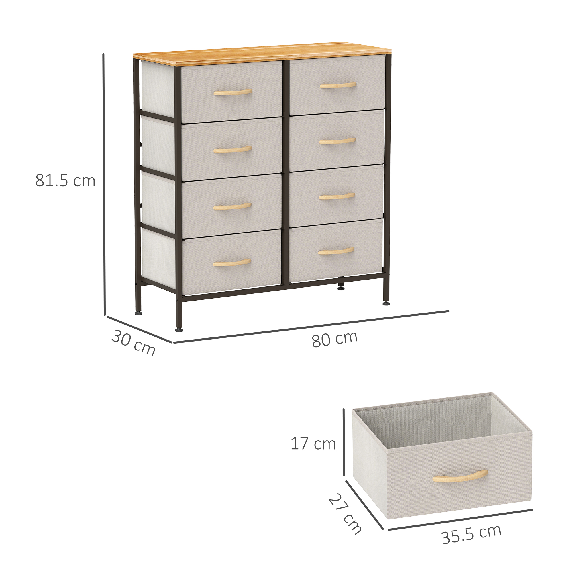 Home storage with this fabric chest of drawers. The eight fabric drawers offer room for lots of things - keep t-shirts, tops, bottoms and more organised. The wood-effect top offers more room: a great place to display your favourite photos. The steel frame makes a strong core, with adjustable feet for balance. Comes with anti-tipping straps for safety. Use all over the home and office.