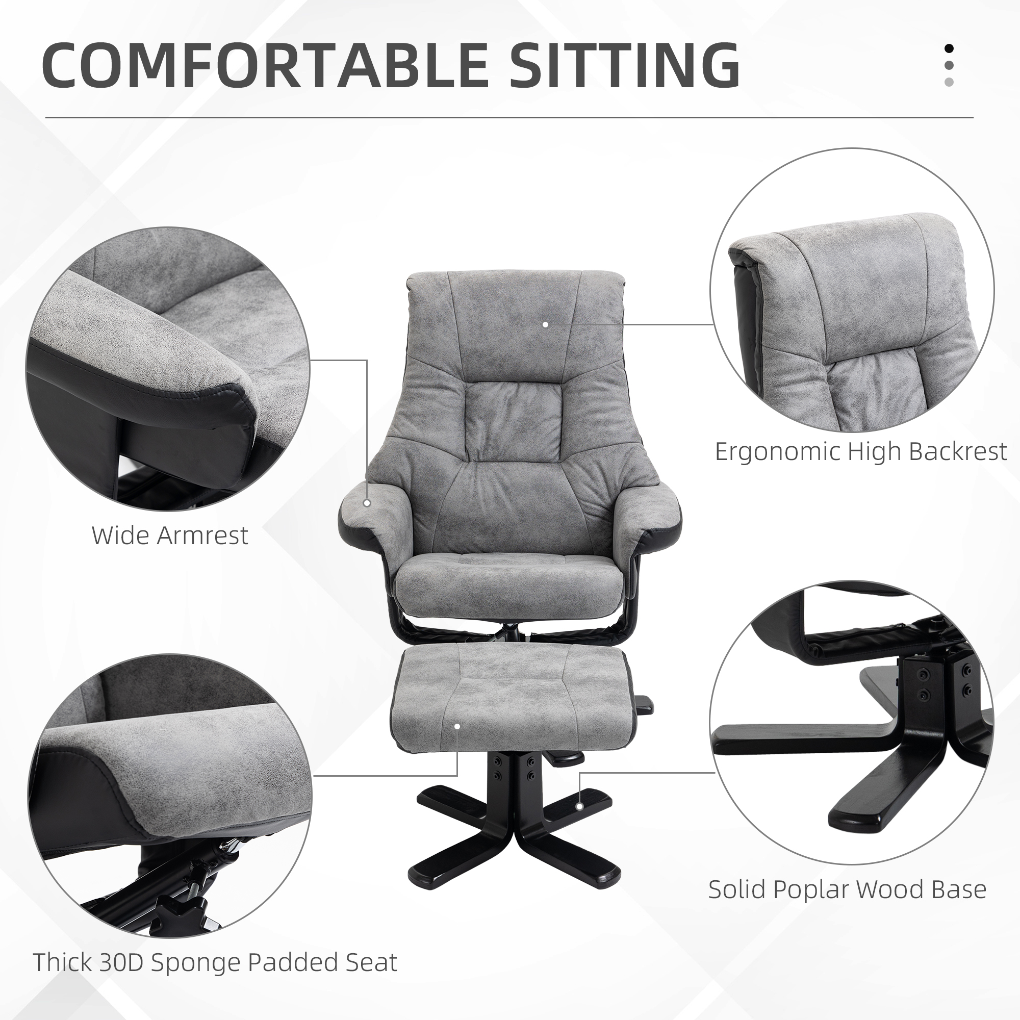 Sink into double the comfort with armchair and footstool duo from . Shaped into a large size, the swivel recliner chair is covered in thick foam padding for comfort, with breathable micro fiber upholstery, in a vintage looked finish for a cool and timeless look. This swivel chair can recline back to a maximum 135° angle via the under-seat handle, making it perfect paired with the footstool.The perfect spot for your afternoon time-outs.