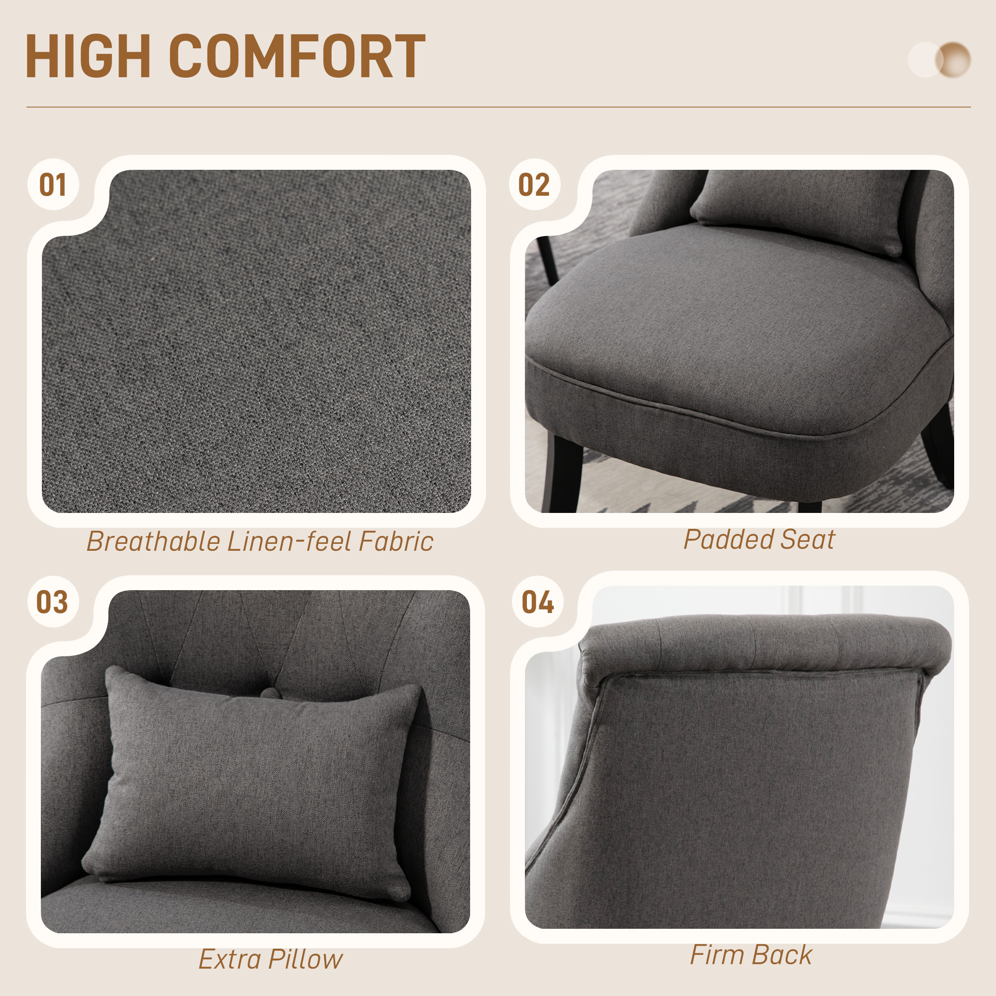 Sink into something comfortable without sacrificing on your precious home space with this accent chair, from . Linen-look fabric, the curved wooden legs and delicate button tufting on the back evokes a vintage style - a statement in any setting. Soft cushioned seat and curved backrest for comfort and support. Something different for this season and beyond.