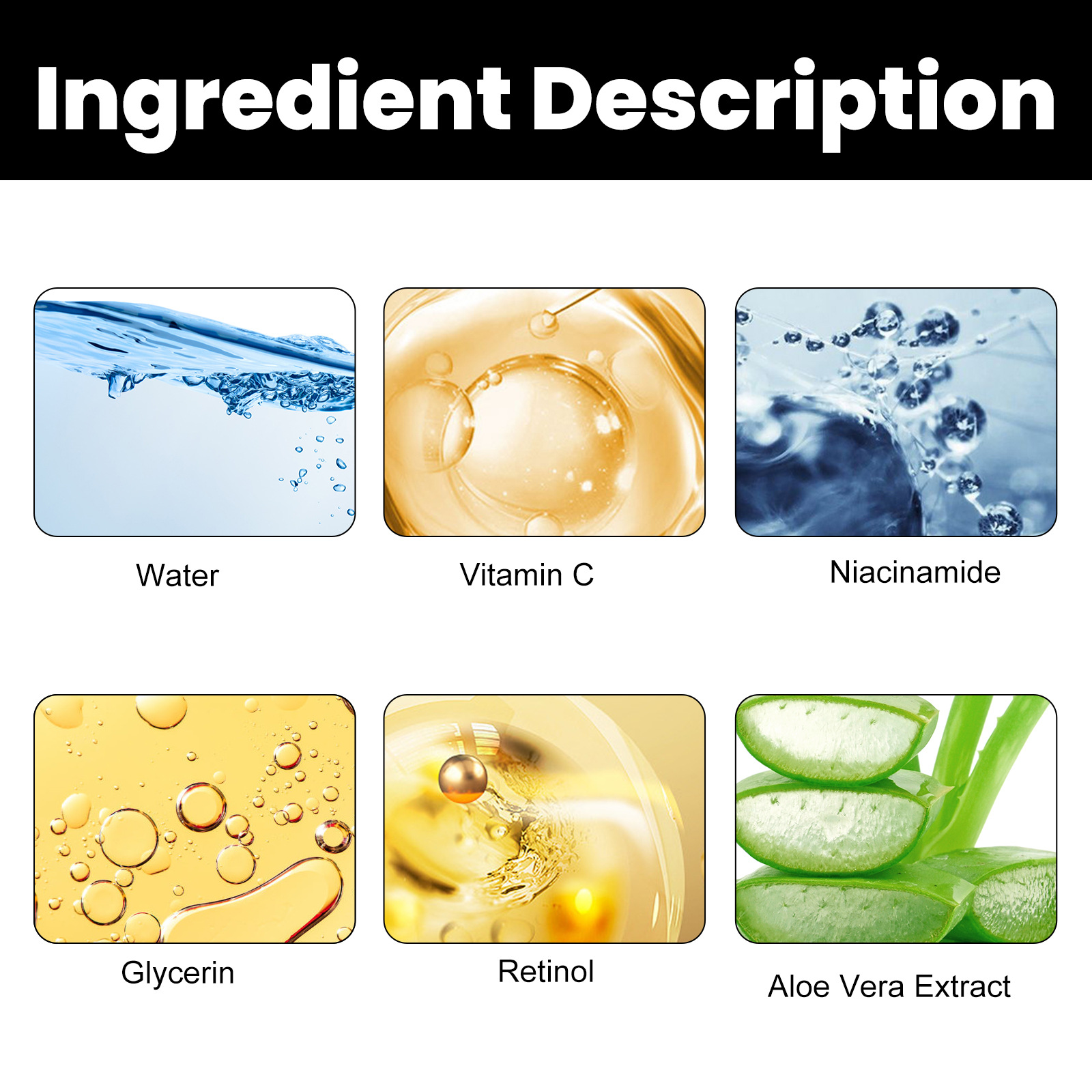 Ingredients: Water, retinol, ascorbic acid (vitamin C), nicotinamide, aloe extract, glycerin
