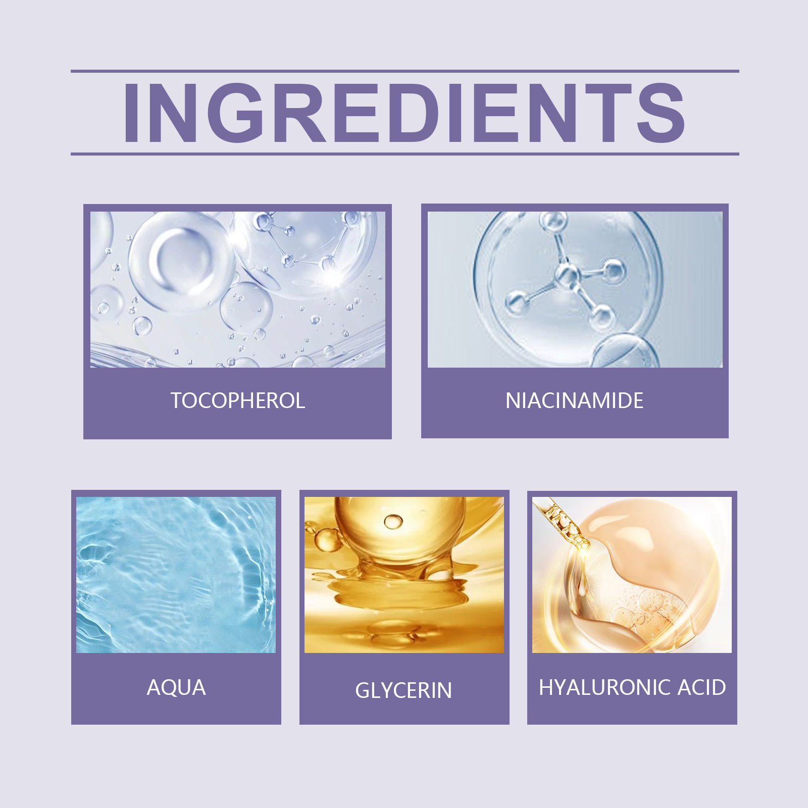 Ingredients: Water, nicotinamide, tocopherol (vitamin E) glycerin, hyaluronic acid