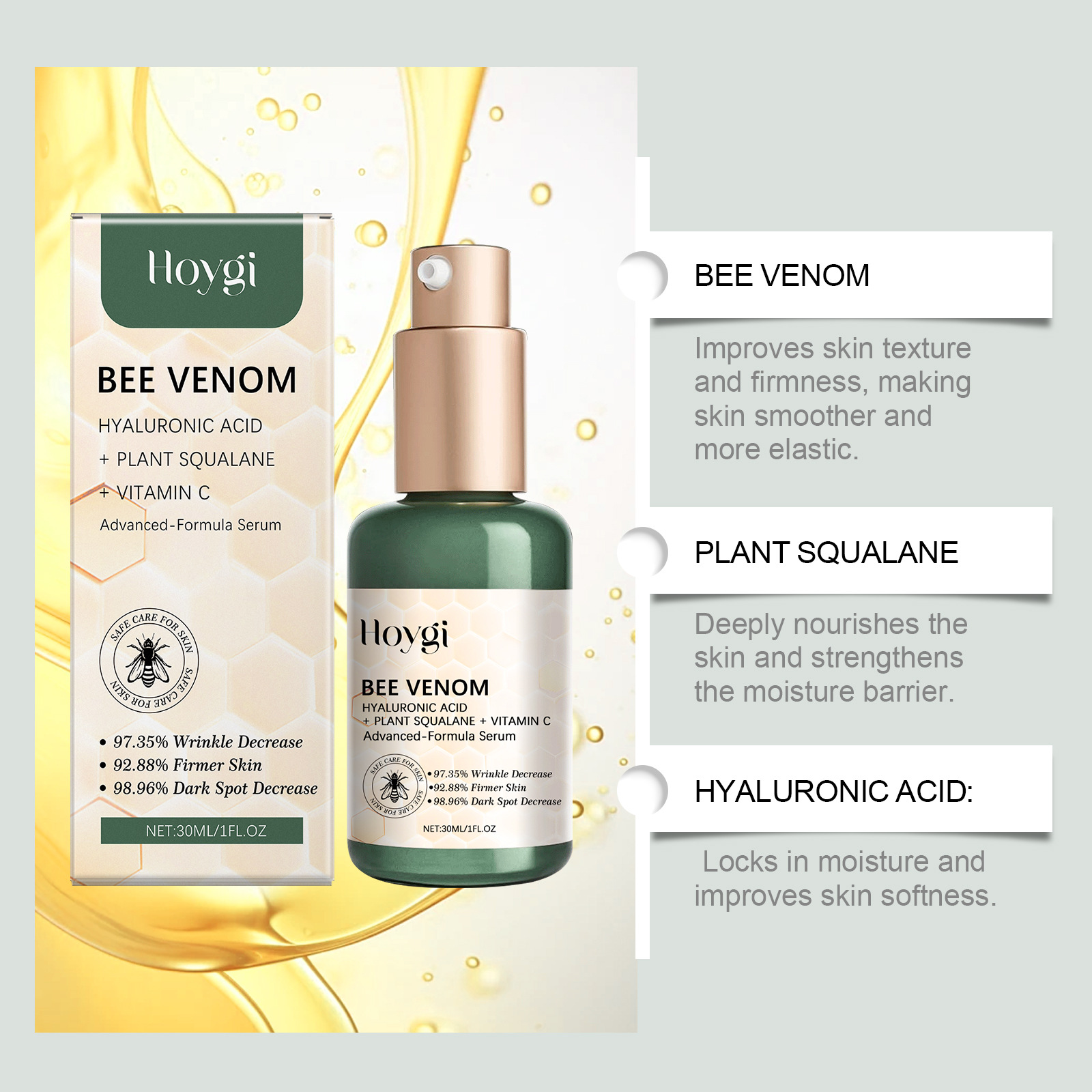 Ingredients: Water, glycerol, Hydroxyethyl Cellulose, bee venom, squalane, hyaluronic acid, vitamin C (ascorbic acid)