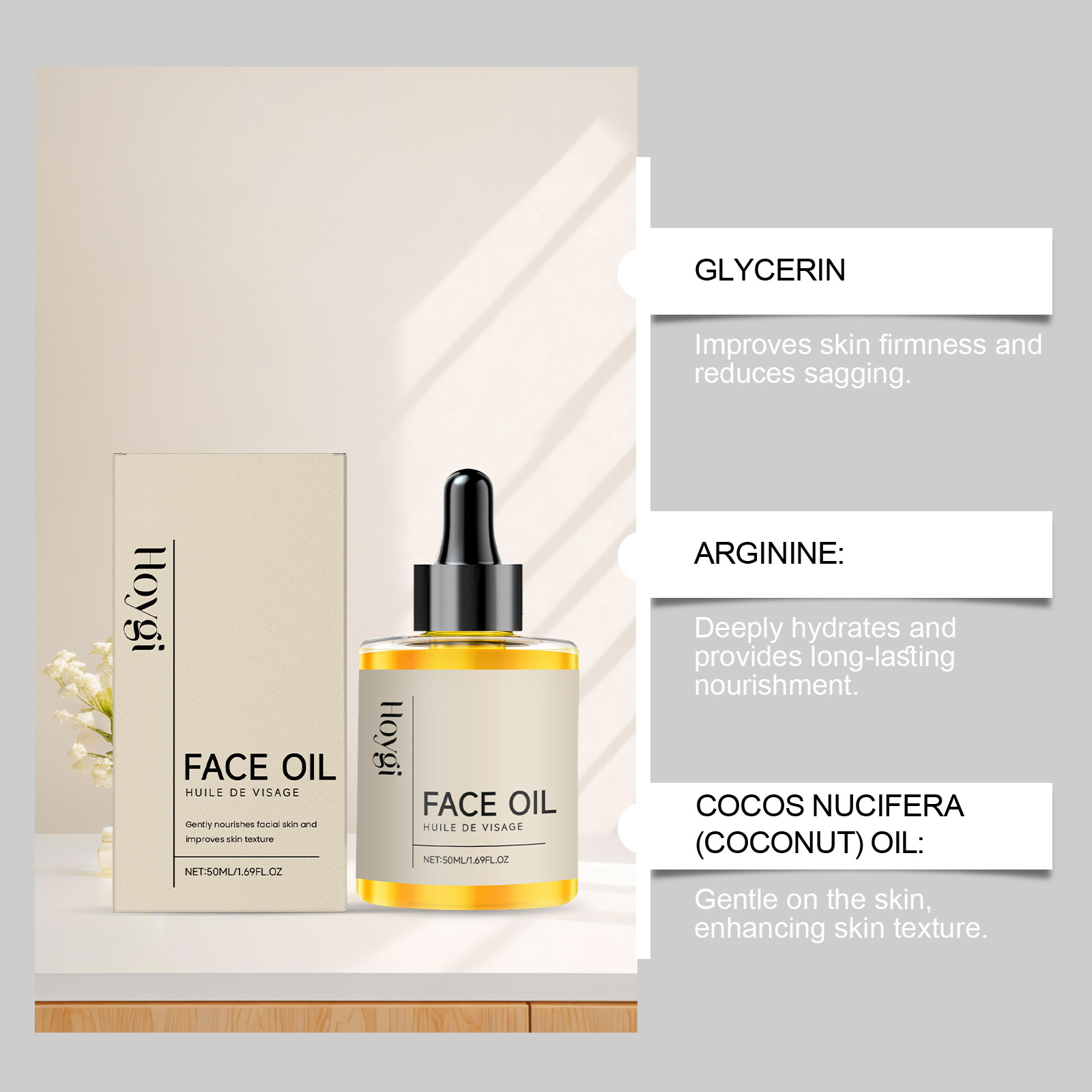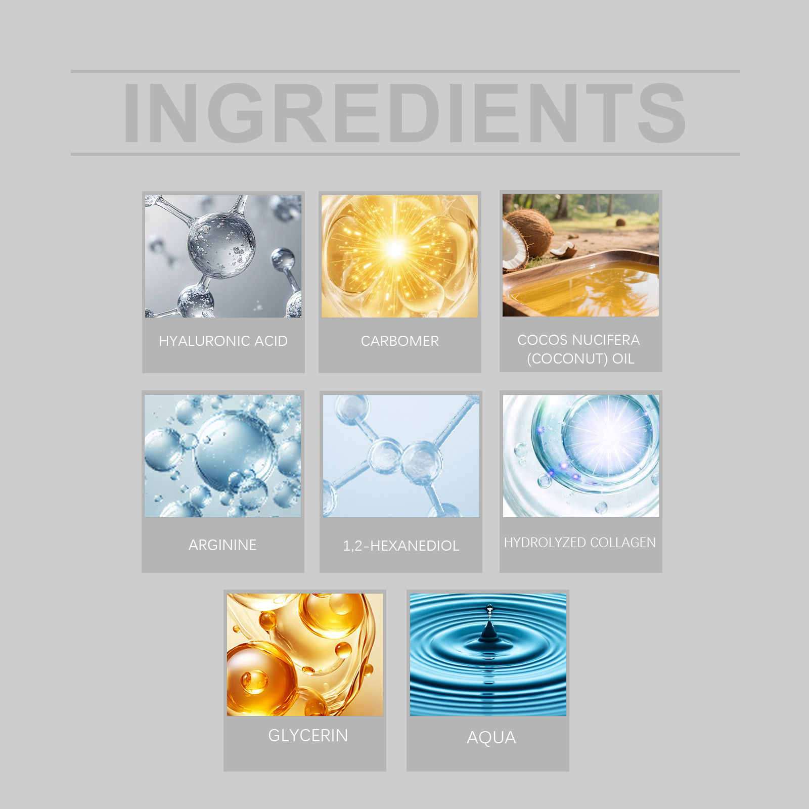 Ingredients: water, glycerin, 1,2- hexanediol, carbomer, arginine, hyaluronic acid, hydrolyzed collagen, coconut oil.