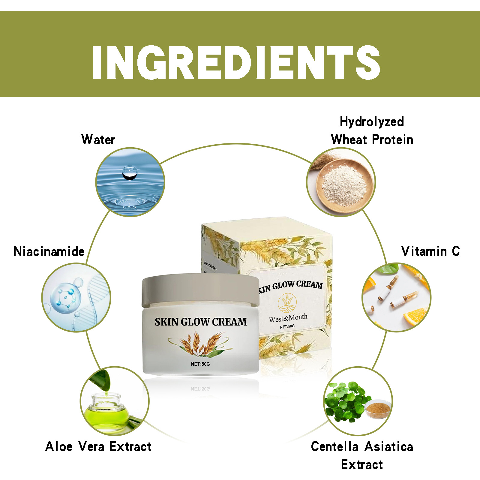 Ingredients Water, Hydrolyzed Wheat Protein, Nicotinamide, Vitamin C, Aloe Extract, Asiatic Centella Extract