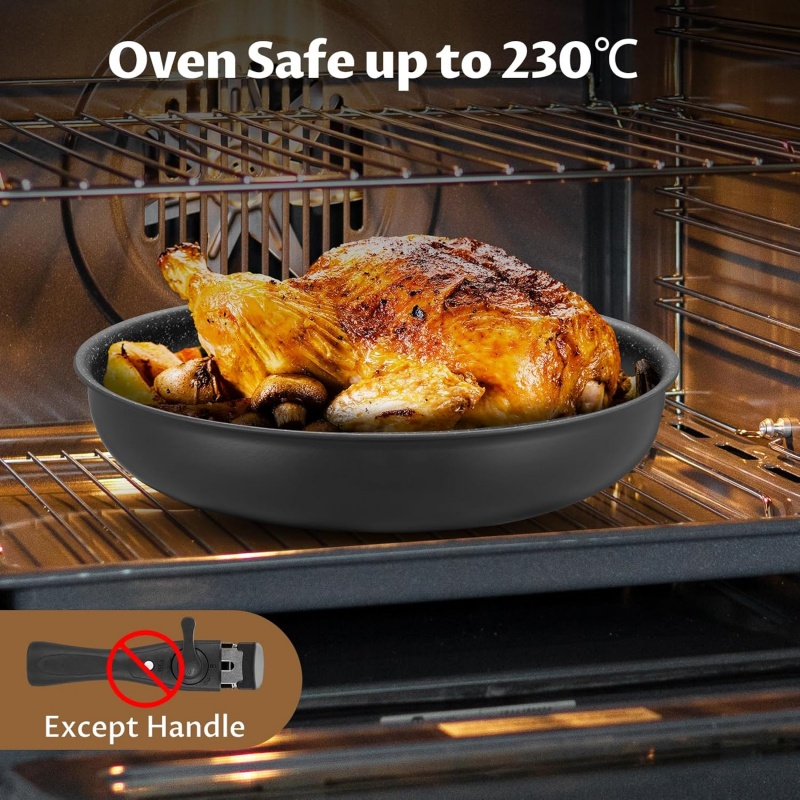 Detachable handles provide secure grip and stability with strong weight-bearing capacity-easily go from stovetop to oven, grill, fridge, or dining table with just a click.
