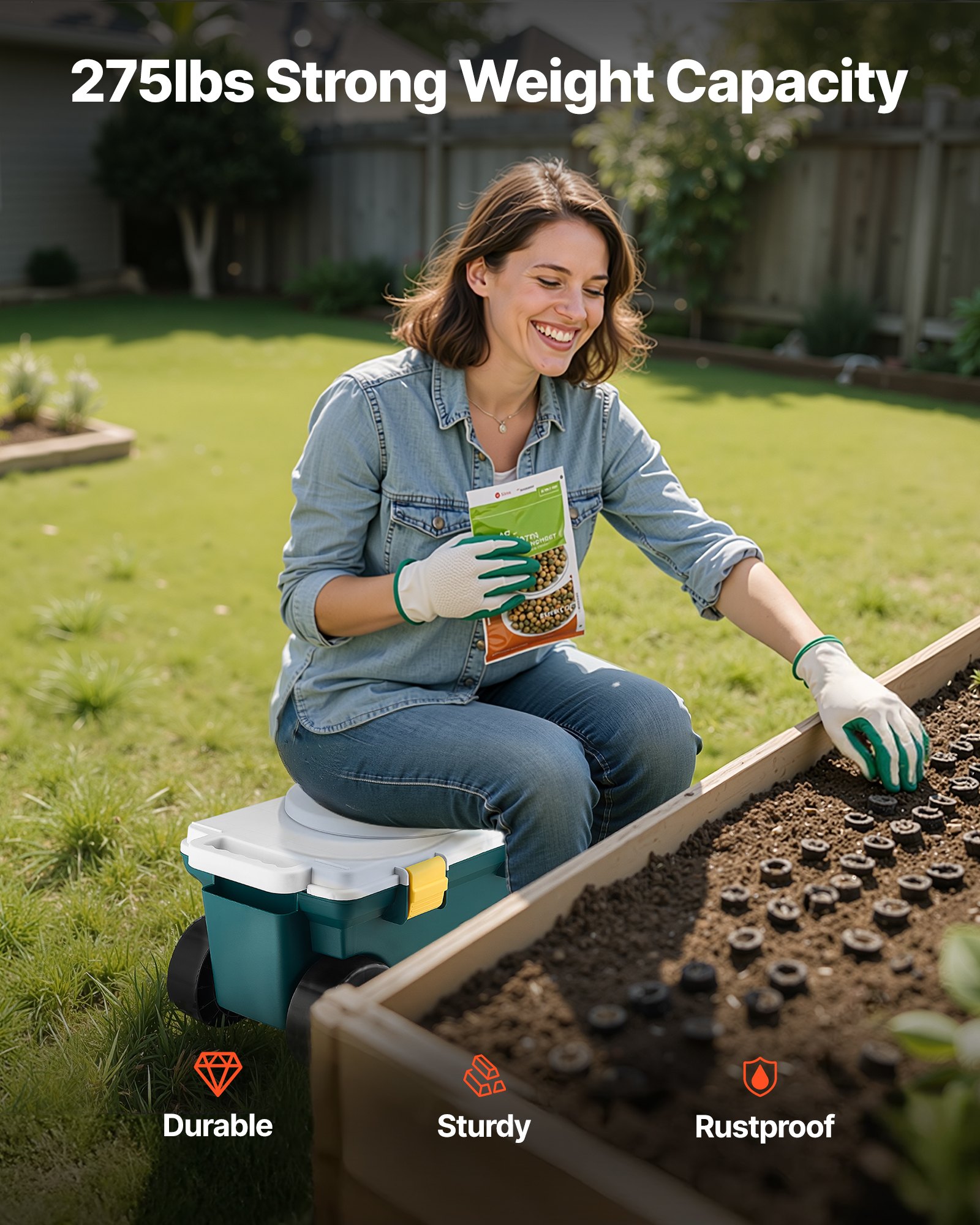 VEVOR Fahrbarer Gartensitz 520 x 310 x 280 mm, Sitzwagen, 2-in-1-Gartenwagen, Rollsitz, Tragkraft bis zu 123 kg, Gartenhelfer, Gartenhocker mit Stauraum zum Jäten & Pflanzen im Garten