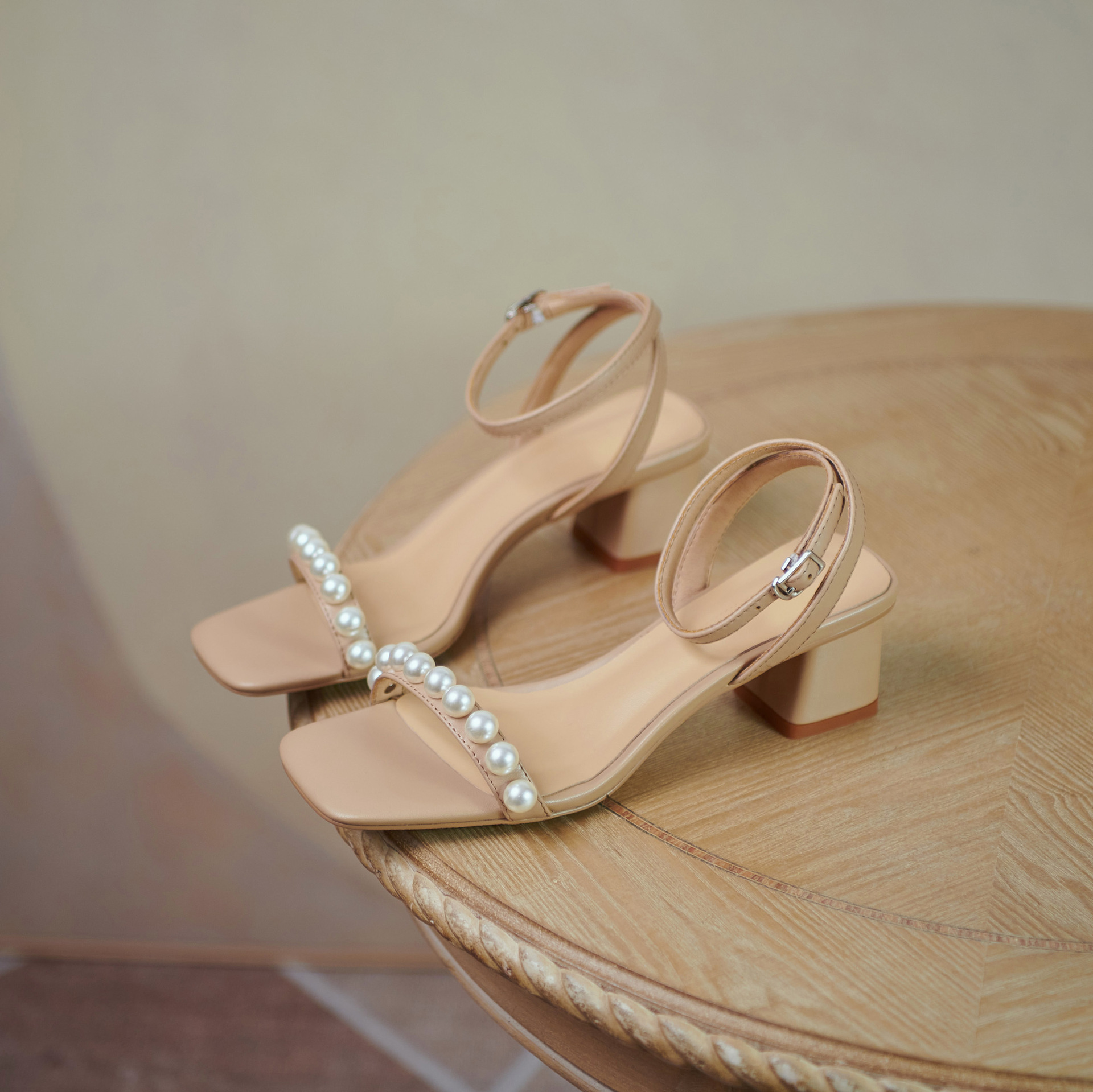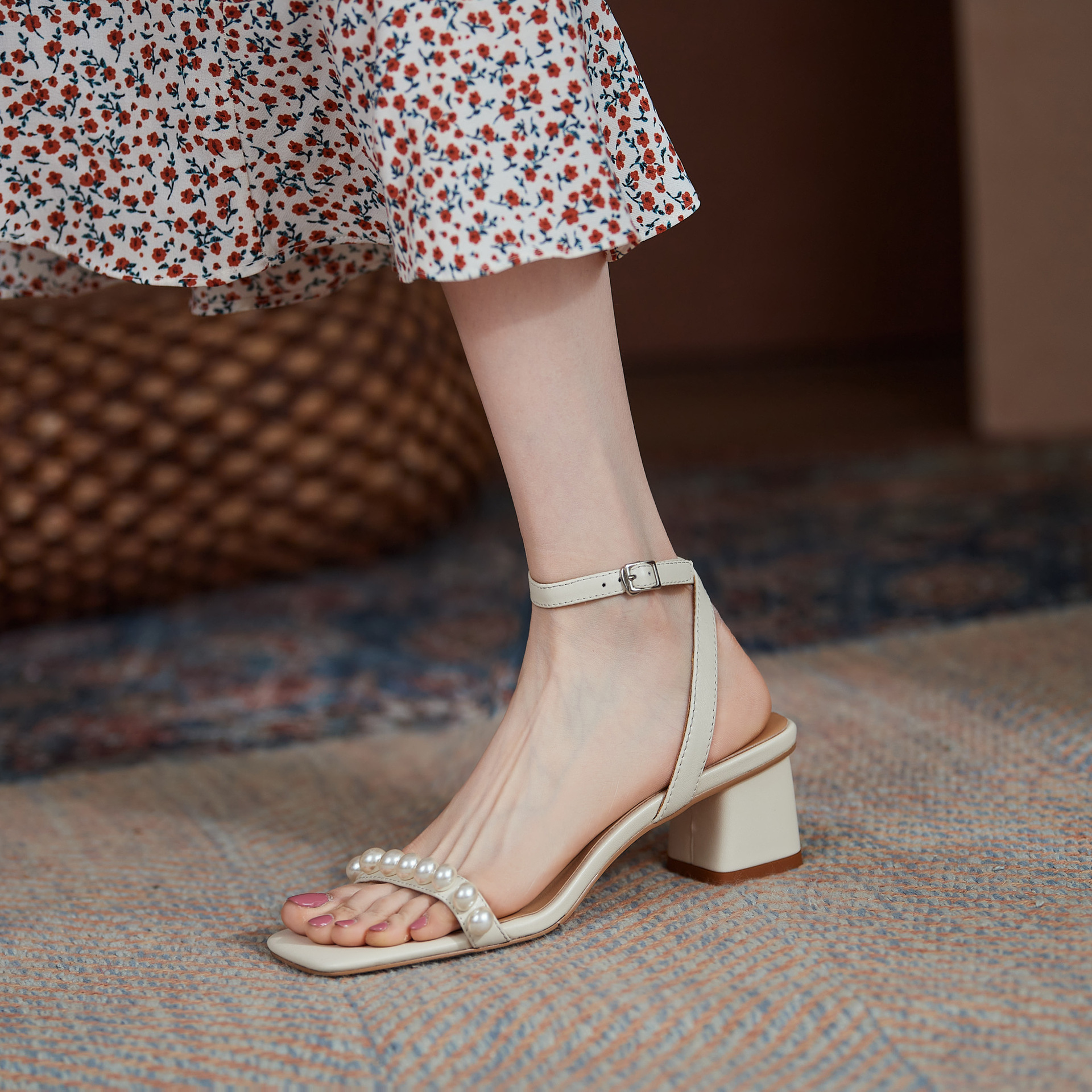 Fairy Style Pearl Sandals Women's New Korean Style Thick Heel With Square