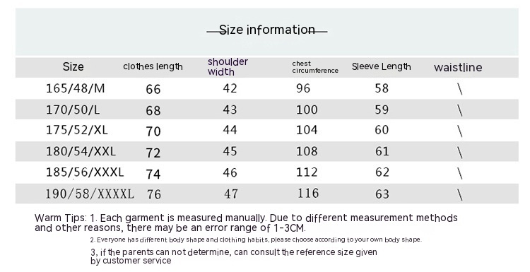 Size: 165/105/m,170/110/l,175/115/xl,180/120/xxl,185/125/xxl