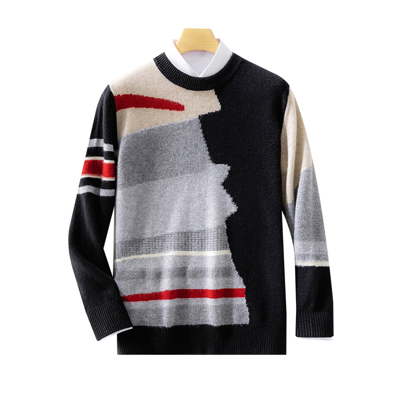 Fall Winter Men Round Neck Contrast Color Style Woolen Sweater