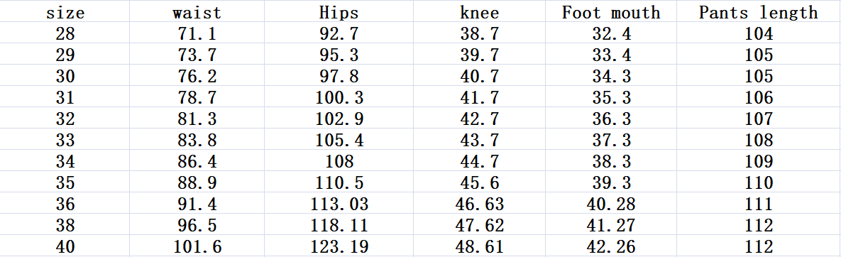 Size: 28, 29, 30, 31, 32, 33, 34, 36, 38, 40