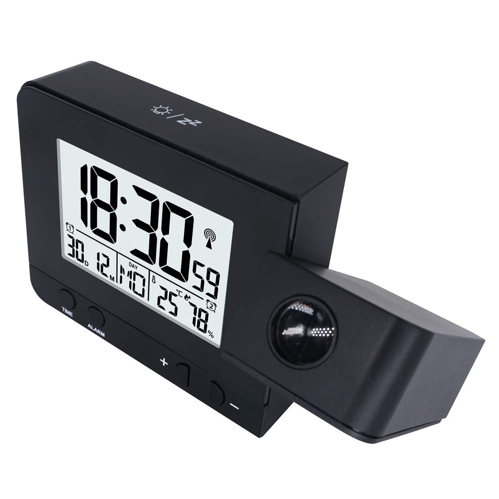 1. All-in-one Functions ----- Wireless projection alarm clock with indoor temperature and humidity display; Temperature and time projection with ON or OFF button; 1 USB charger port; 2 alarm and snooze functions; Calendar with 7 language selection; Time in 12/24 format; 4-level backlight selectable with power supply.
