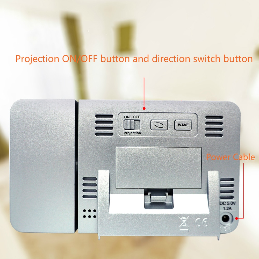 2. Projection Function ----- All information on the display can be easily read from any angle. Project time and temperature at the same time. Press the button to project for 8 seconds with battery and keep project with power cable, you can also use ON or OFF button to control it. Adjustable projection angle let you can select the appropriate angle for time project.