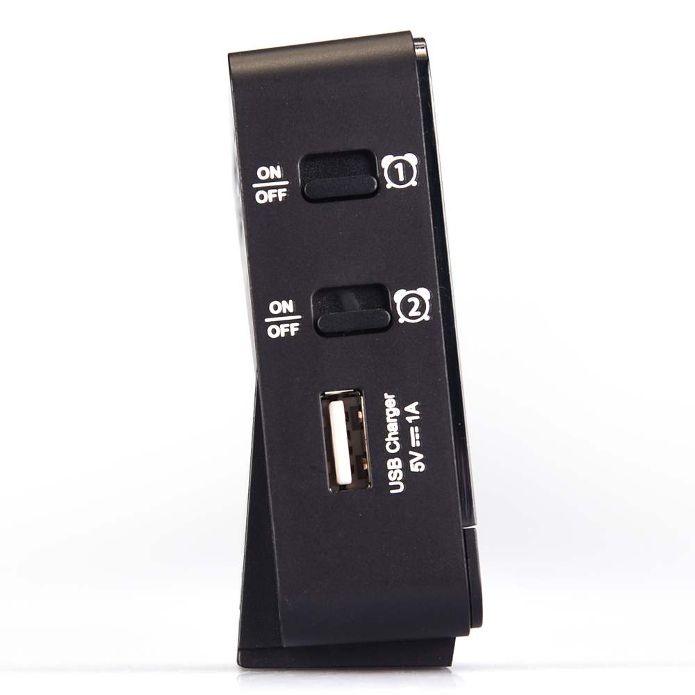 4. USB Charger, Double Alarm with Snooze Function ----- Set two separate alarms allow you to set different alarm for different purposes. Press the top button to doze the alarm for an extra five minutes of sleep. USB output interface on the left allows easy charging of electronic device.
