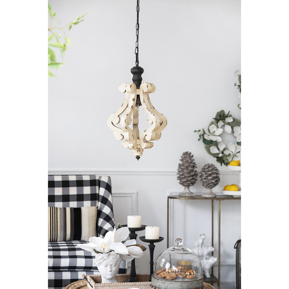 The Harper One-Light pendant creates a luxurious style with its antique white finish and ornate curves. Hang it above the farmhouse table, in the garden conservatory or in the master bathroom for a classic look. With the warmth of wood and the strength of iron, the Harper chandelier will fill your home with charm for years to come.