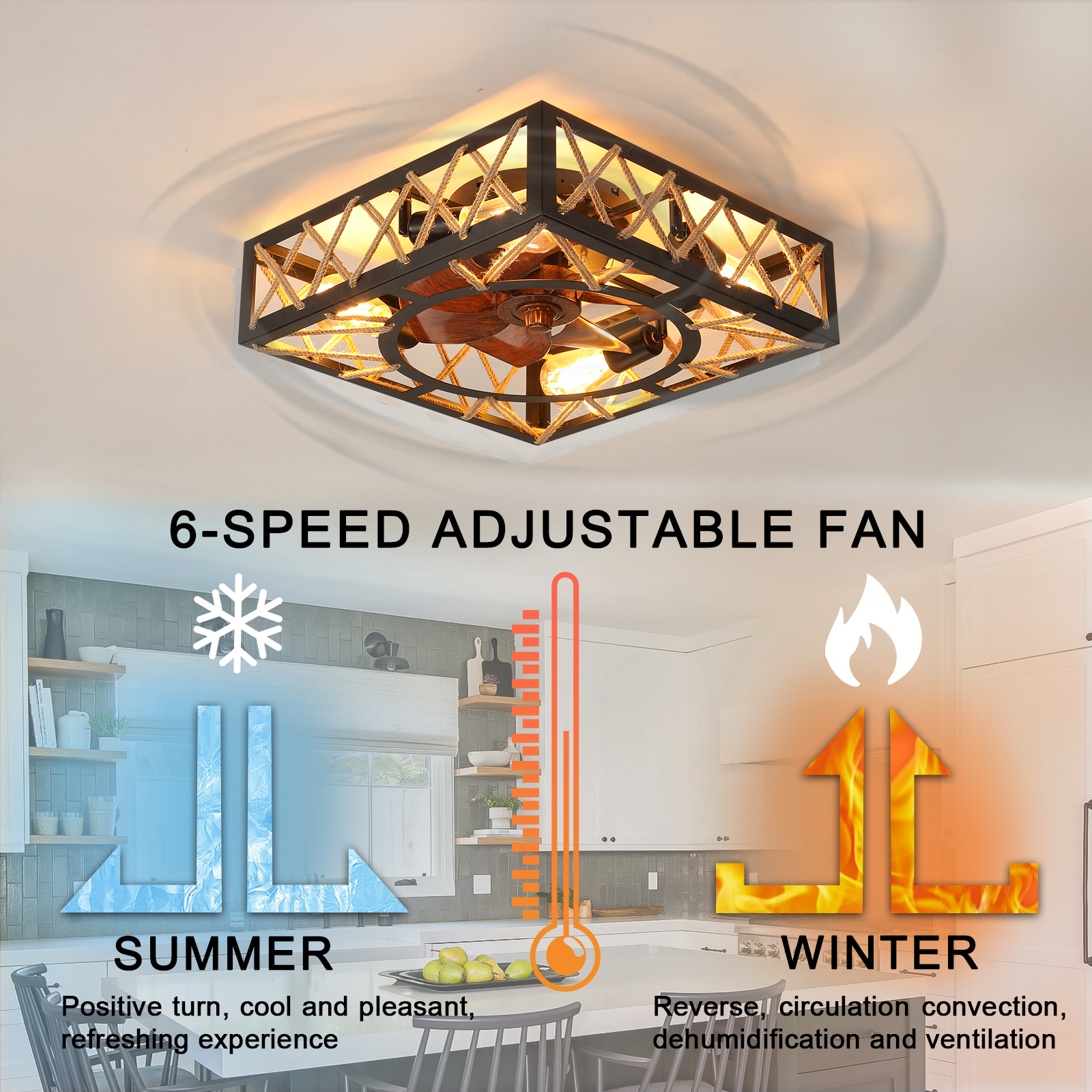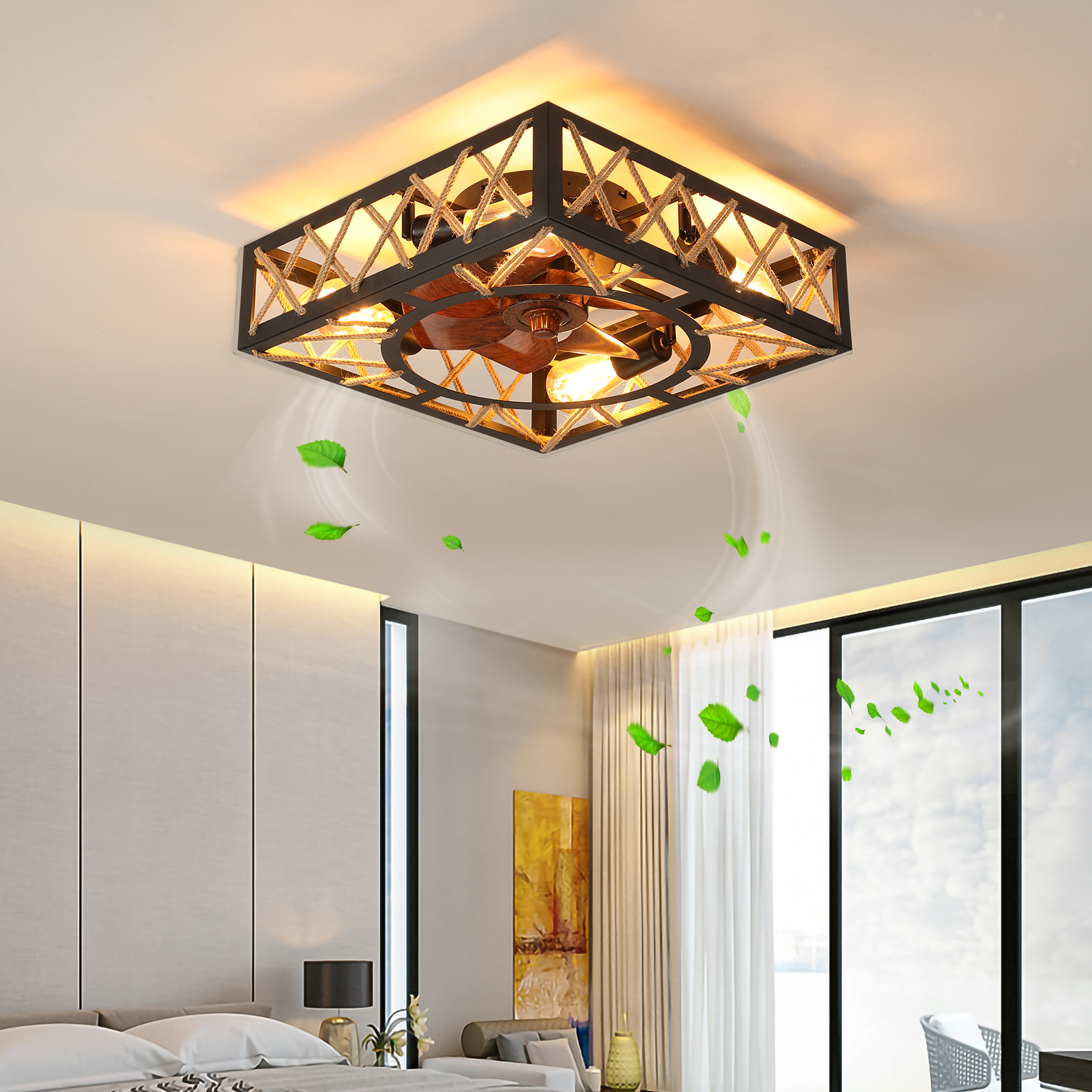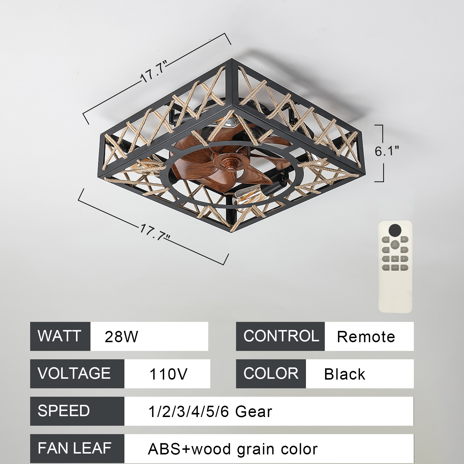 With a quick-installation design, the installation is very simple. The cage-type ceiling fan with a light is equipped with a remote control. It has 6 adjustable wind speeds and can be either reversed or forward.