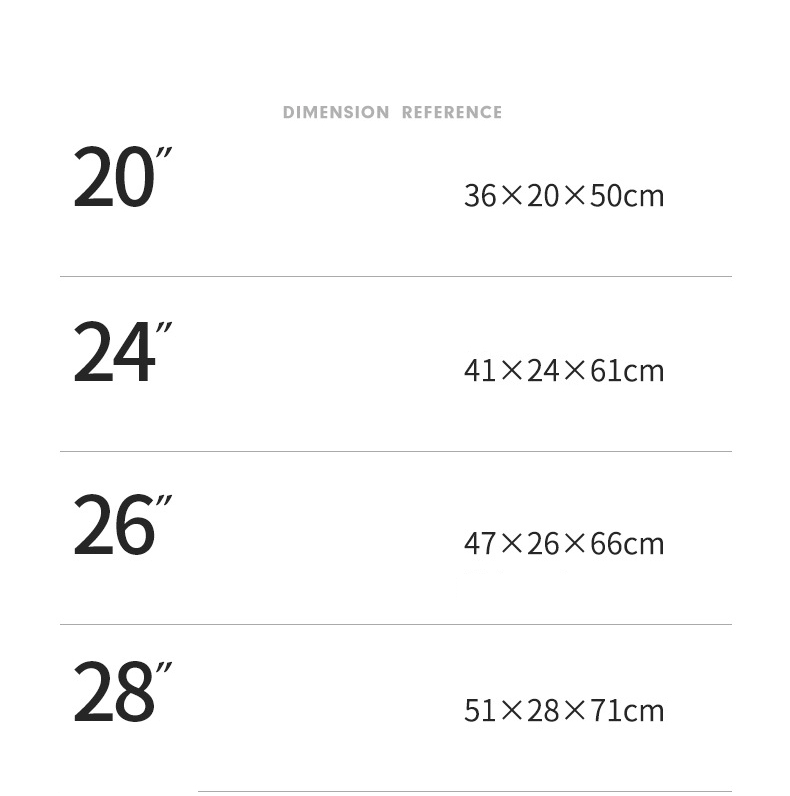Size: 20inches:36*20*50cm/24inches:41*24*61cm/26inches:47*26*66cm/28inches:51*28*71cm