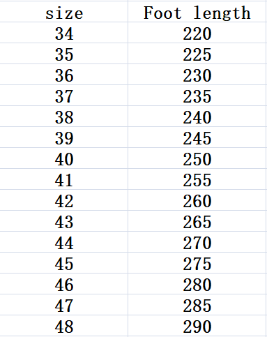 Size: 34, 35, 36, 37, 38, 39, 40, 41, 42, 43, 44, 45, 46, 47, 48
