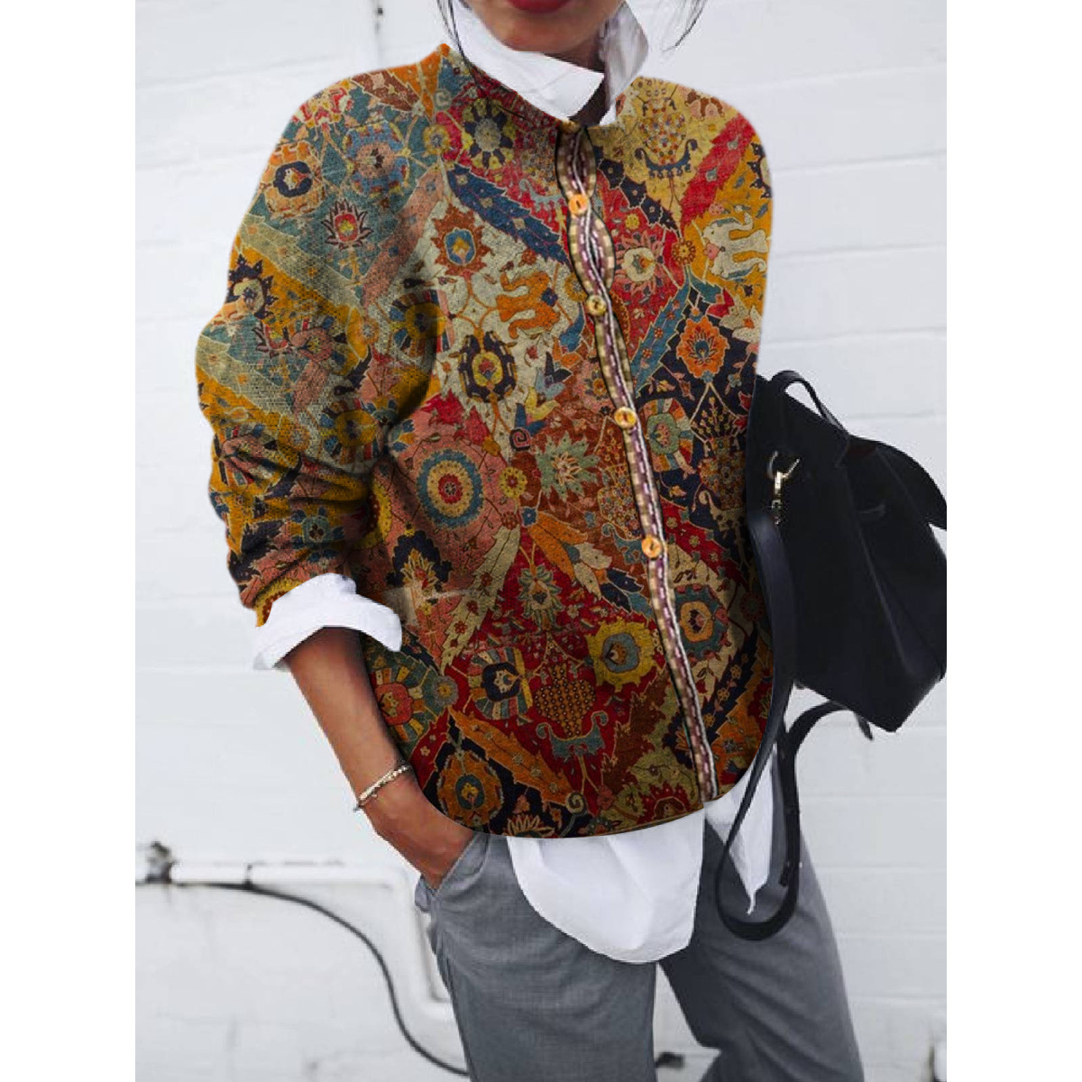 Features: Single-breasted, loose, round neck, printed