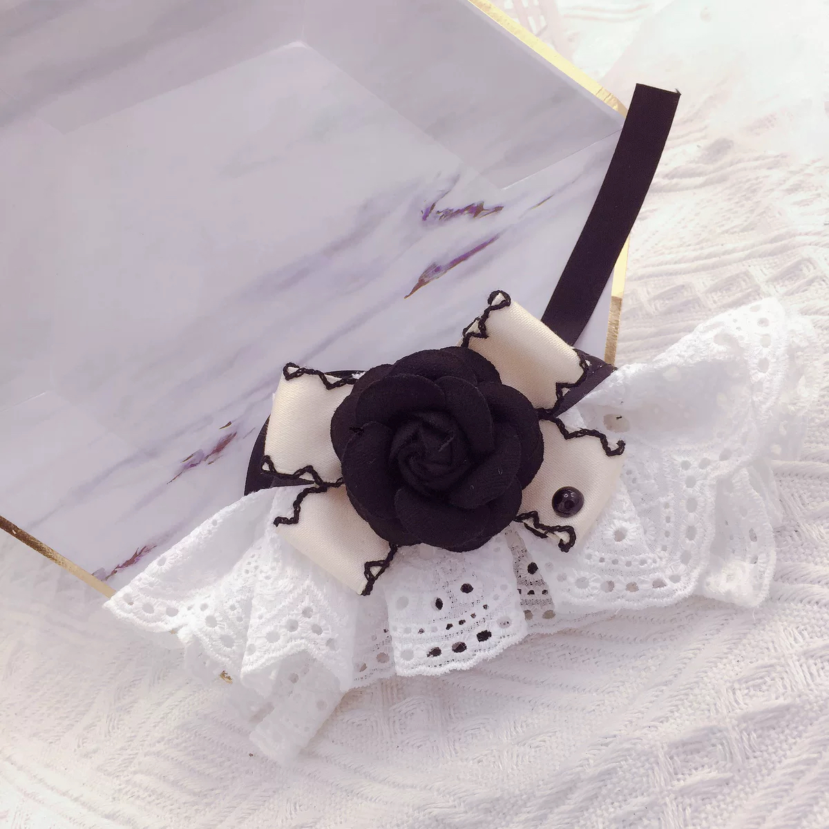 Color classification: White camellia bib, black camellia bib, black bow chiffon bib
