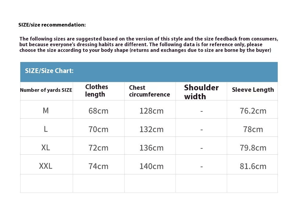 1. Asian sizes are 1 to 2 sizes smaller than European and American people. Choose the larger size if your size between two sizes. Please allow 2-3cm differences due to manual measurement. 2. Please check the size chart carefully before you buy the item, if you don't know how to choose size, please contact our customer service. 3.As you know, the different computers display colors differently, the color of the actual item may vary slightly from the following images.