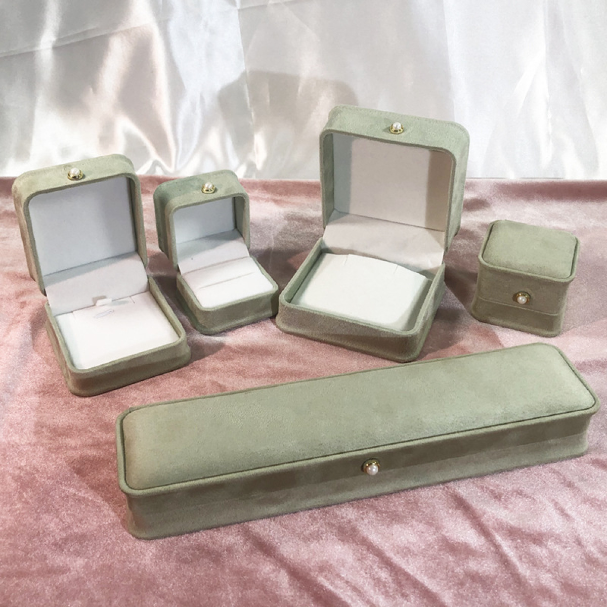 Color: Light green pendant box, light gray bracelet box, light gray ring box, military green ring box, light green ring box, military green pendant box, light gray pendant box, light green bracelet box, military green bracelet box, light green small earring box, light green large earring box, military green small earring box, military green large earring box, light gray large earring box, light gray small earring box