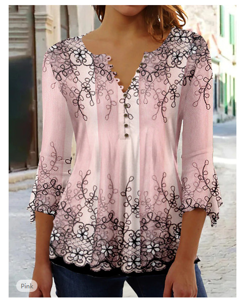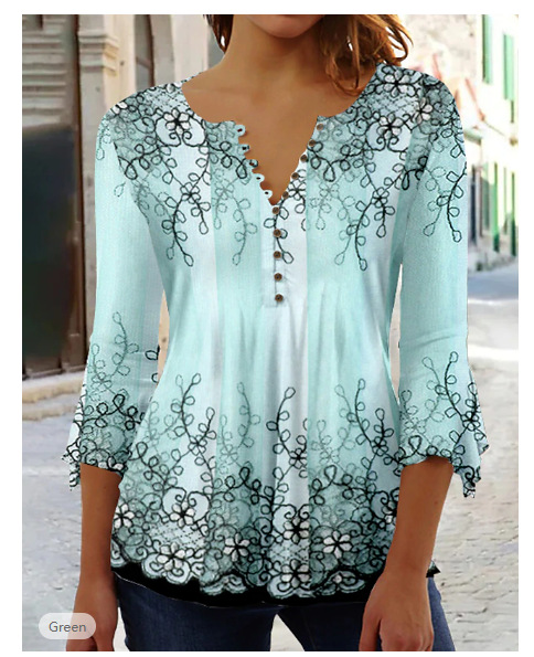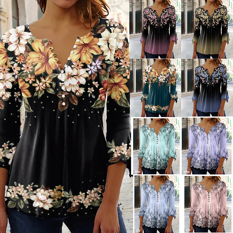 Fashion Flower Printed V-neck Three-quarter-length-sleeved T-shirt