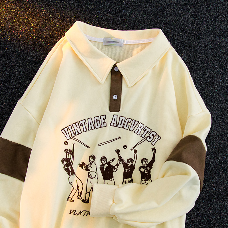 Fashion Loose Embroidered Colorblock Polo Neck Sweatshirt