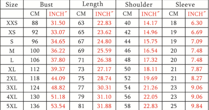 Sizes: XXS, XS, S, M, L, XL, 2XL, 3XL, 4XL, 5XL