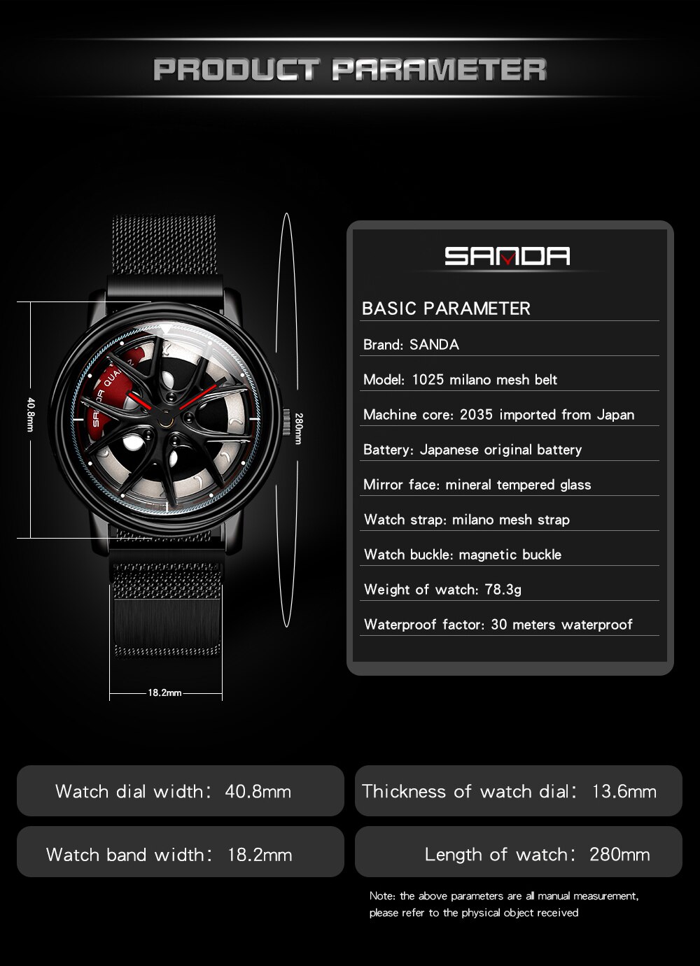 Dial width: 40.8mm, dial thickness: 13.6mm, band width: 19.8mm,