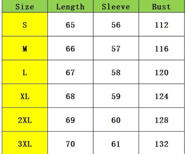 Size:S,M,L,XL,2XL,3XL unit:cm
