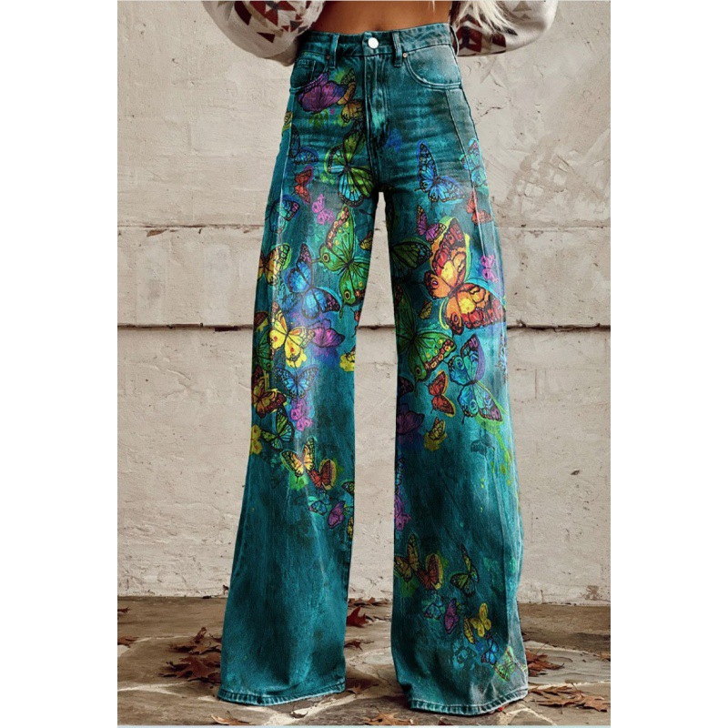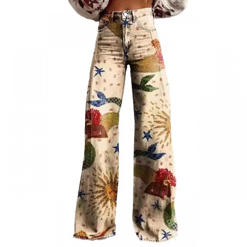 Fashion Women's Printed High Waist Loose Thin Imitation Denim Wide Leg Pants